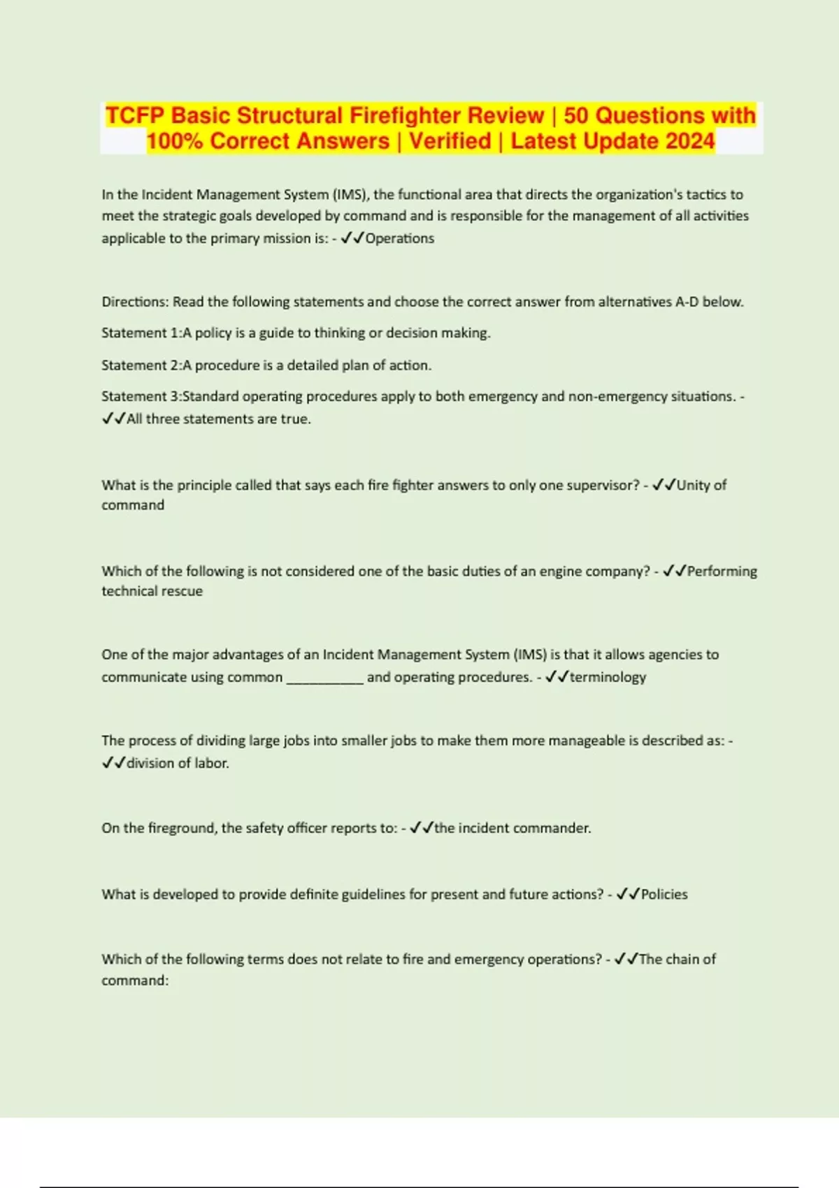 TCFP Basic Structural Firefighter Review | 50 Questions with 100% Correct Answers | Verified | Latest Update 2024