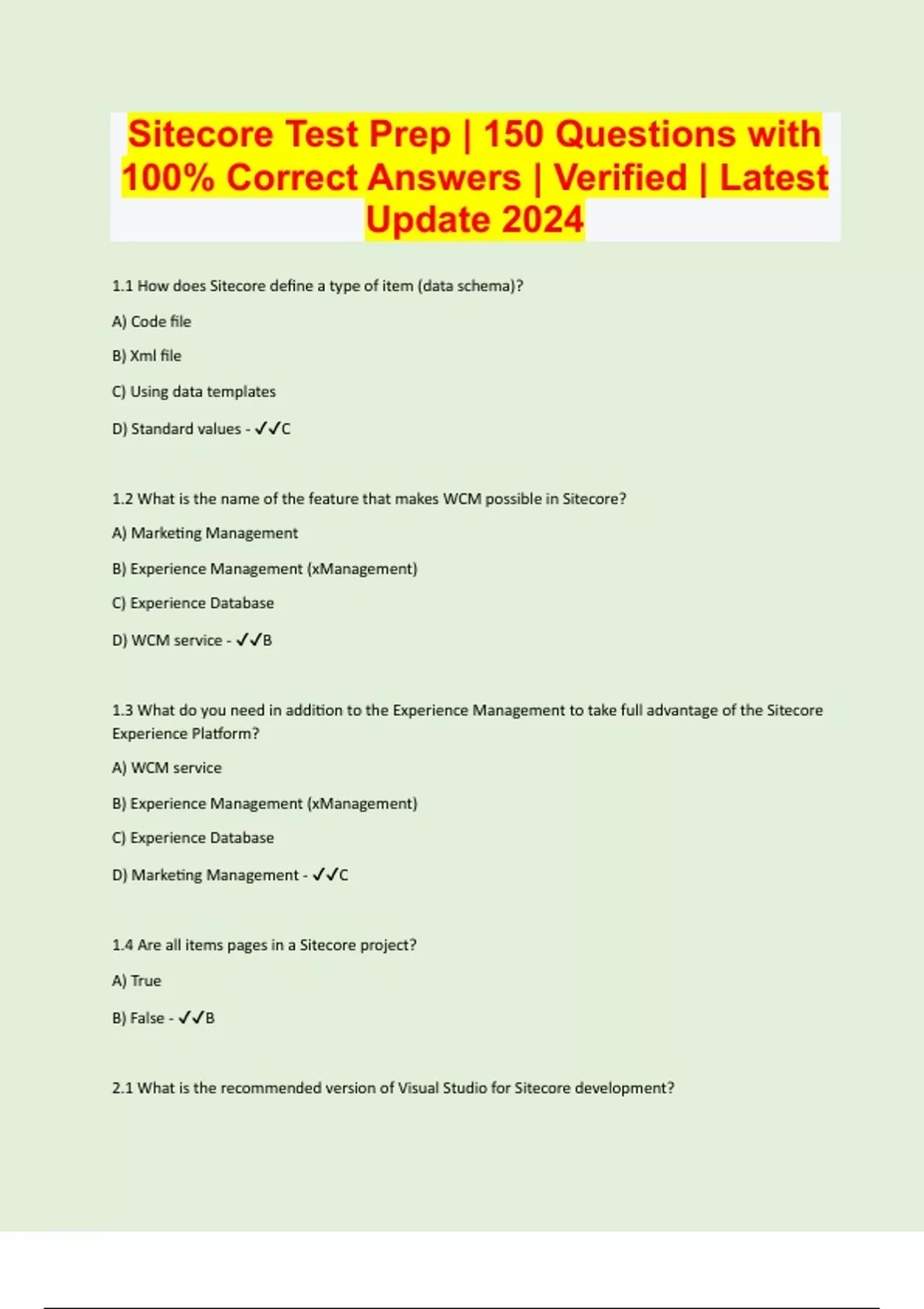 Sitecore Test Prep | 150 Questions with 100% Correct Answers | Verified | Latest Update 2024