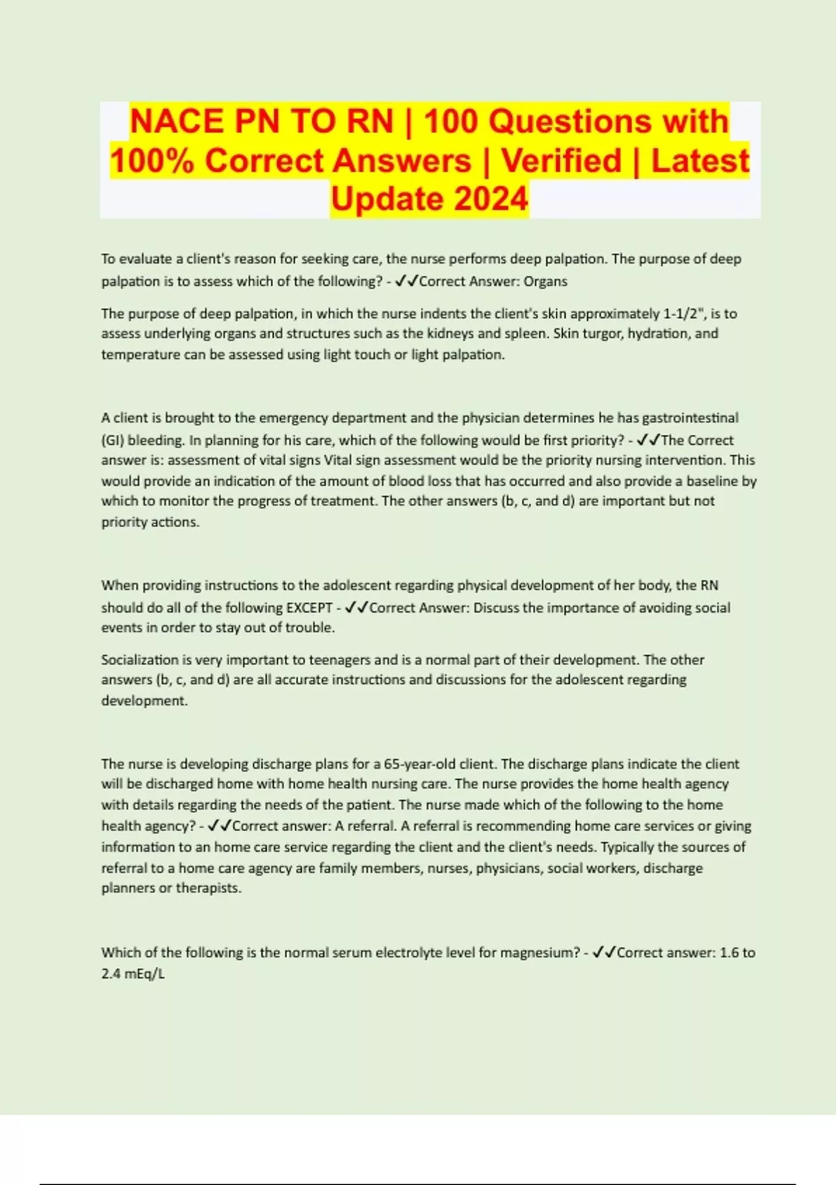 NACE PN TO RN | 100 Questions with 100% Correct Answers | Verified | Latest Update 2024