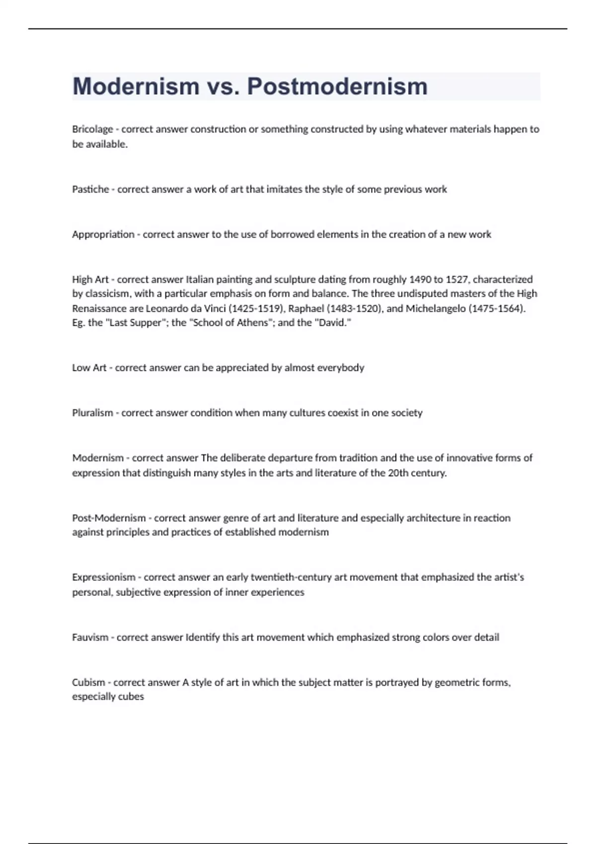 Modernism vs. Postmodernism Question and answers rated A+ 2023/2024 Bricolage - correct answer construction or something constructed by using whatever materials happen to be available. Pastiche - correct answer a work of art that imitates the style of some previous work Appropriation - correct answer to the use of borrowed elements in the creation of a new work High Art - correct answer Italian painting and sculpture dating from roughly 1490 to 1527, characterized by classicism, with a particular emphasis on form and balance. The three undisputed masters of the High Renaissance are Leonardo da Vinci (), Raphael (), and Michelangelo (). Eg. the "Last Supper"; the "School of Athens"; and the "David." Low Art - correct answer can be appreciated by almost everybody Pluralism - correct