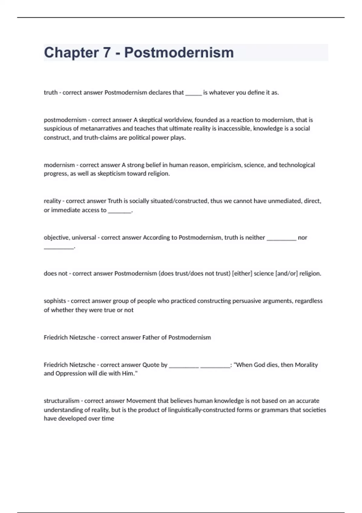 Chapter 7 - Postmodernism Questions with complete solution 2023/2024truth - correct answer Postmodernism declares that _____ is whatever you define it as. postmodernism - correct answer A skeptical worldview, founded as a reaction to modernism, that is suspicious of metanarratives and teaches that ultimate reality is inaccessible, knowledge is a social construct, and truth-claims are political power plays. modernism - correct answer A strong belief in human reason, empiricism, science, and technological progress, as well as skepticism toward religion. reality - correct answer Truth is socially situated/constructed, thus we cannot have unmediated, direct, or immediate access to _______. objective, universal - correct answer According to Postmodernism, truth is neither _________ nor _________.