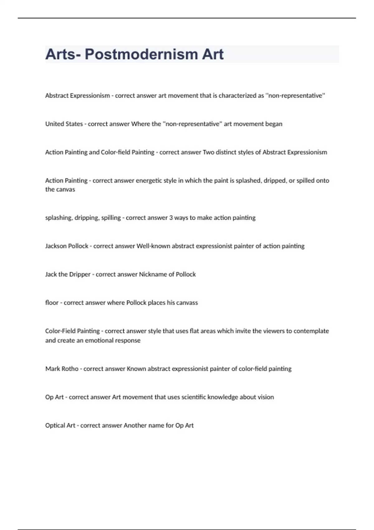 Arts- Postmodernism Art Question and answers already part 2023/2024Abstract Expressionism - correct answer art movement that is characterized as ''non-representative'' United States - correct answer Where the ''non-representative'' art movement began Action Painting and Color-field Painting - correct answer Two distinct styles of Abstract Expressionism Action Painting - correct answer energetic style in which the paint is splashed, dripped, or spilled onto the canvas splashing, dripping, spilling - correct answer 3 ways to make action painting Jackson Pollock - correct answer Well-known abstract expressionist painter of action painting