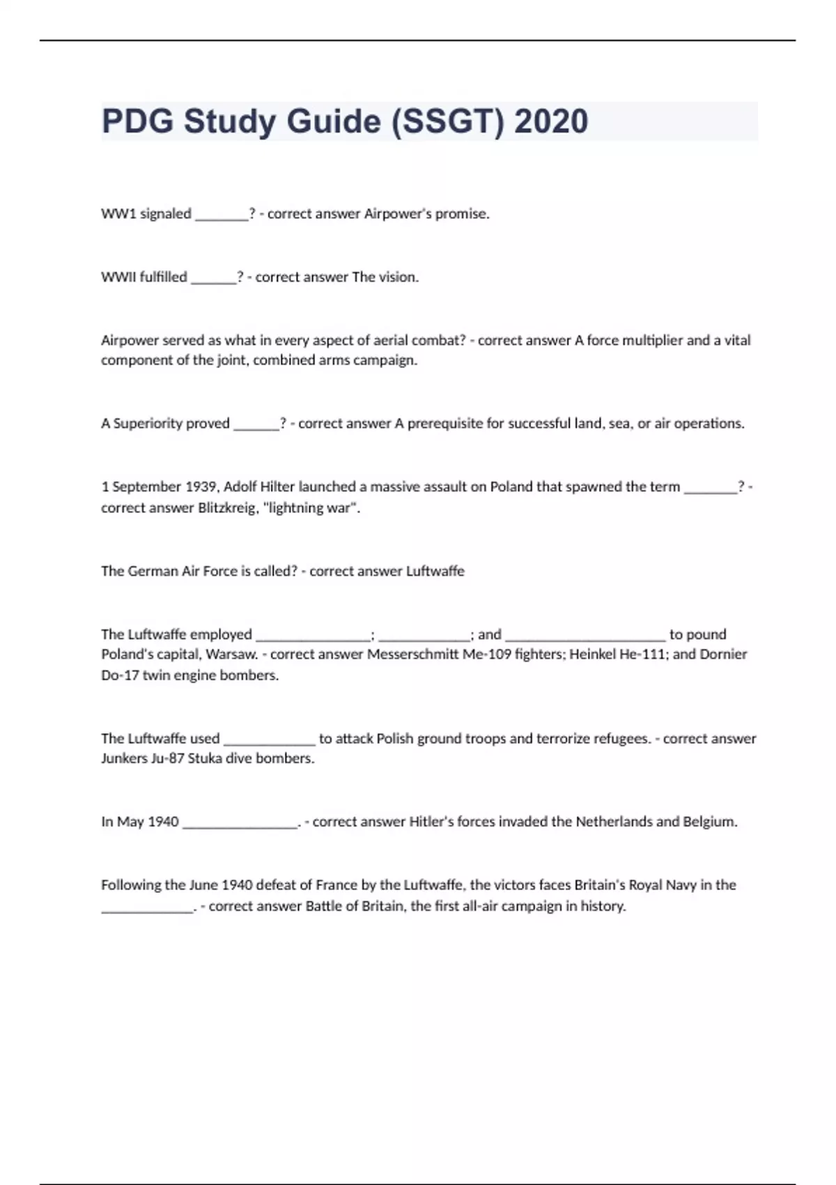PDG Study Guide (SSGT) 2020(UPDATED) Question and answers rated A+ WW1 signaled _______? - correct answer Airpower's promise. WWII fulfilled ______? - correct answer The vision. Airpower served as what in every aspect of aerial combat? - correct answer A force multiplier and a vital component of the joint, combined arms campaign. A Superiority proved ______? - correct answer A prerequisite for successful land, sea, or air operations. 1 September 1939, Adolf Hilter launched a massive assault on Poland that spawned the term _______? - correct answer Blitzkreig, "lightning war". The German Air Force is called? - correct answer Luftwaffe The Luftwaffe employed _______________; ____________; and _____________________ to pound Poland's capital, Warsaw. - correct answer Messerschmitt Me-109 fighters; Heinkel He-111; and Dornier Do-17 twin engine b