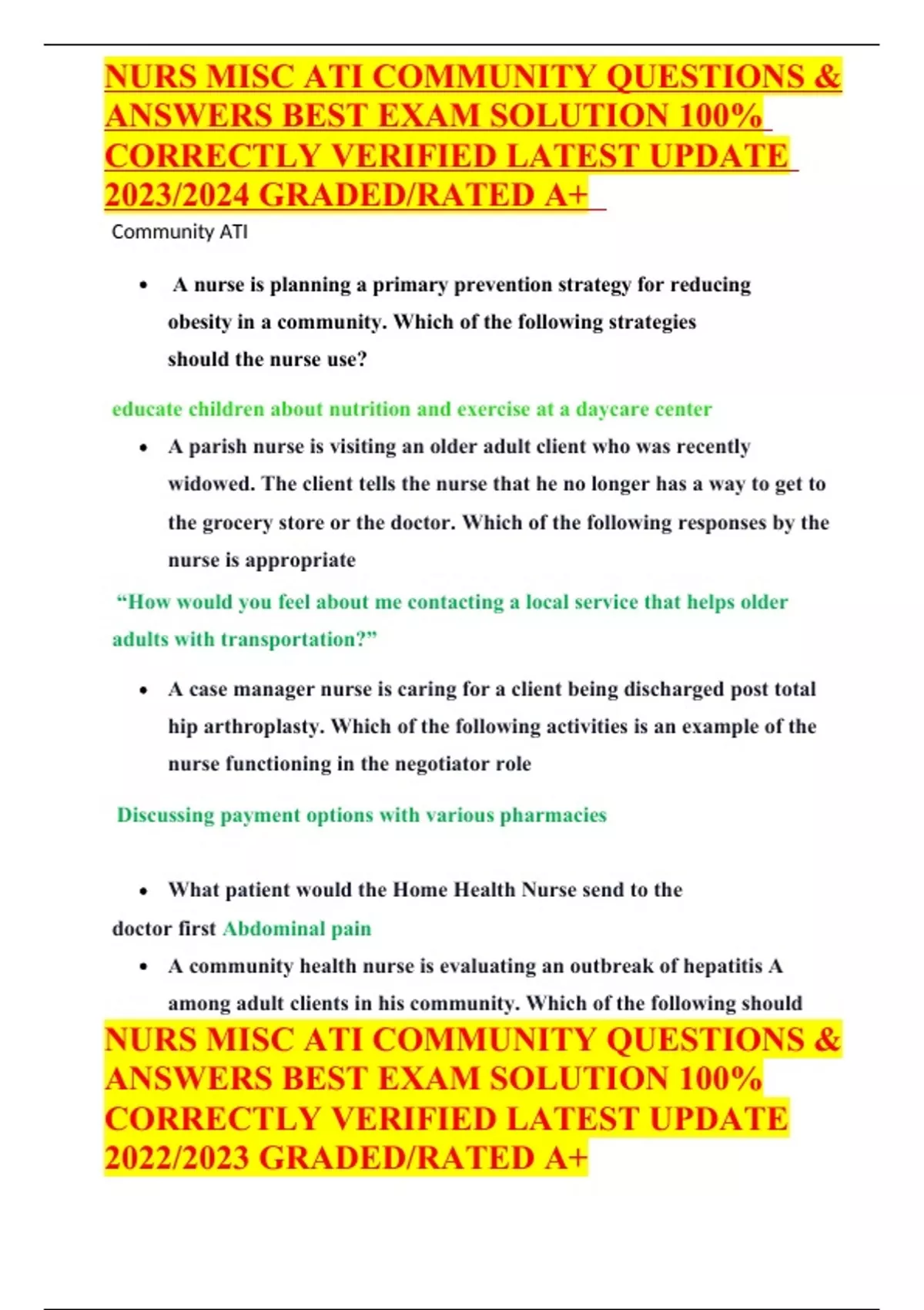 NURS MISC ATI COMMUNITY QUESTIONS & ANSWERS BEST EXAM SOLUTION 100% CORRECTLY VERIFIED LATEST UPDATE 2023/2024 GRADED/RATED A+NURS MISC ATI COMMUNITY QUESTIONS & ANSWERS BEST EXAM SOLUTION 100% CORRECTLY VERIFIED LATEST UPDATE 2023/2024 GRADED/RATED A+