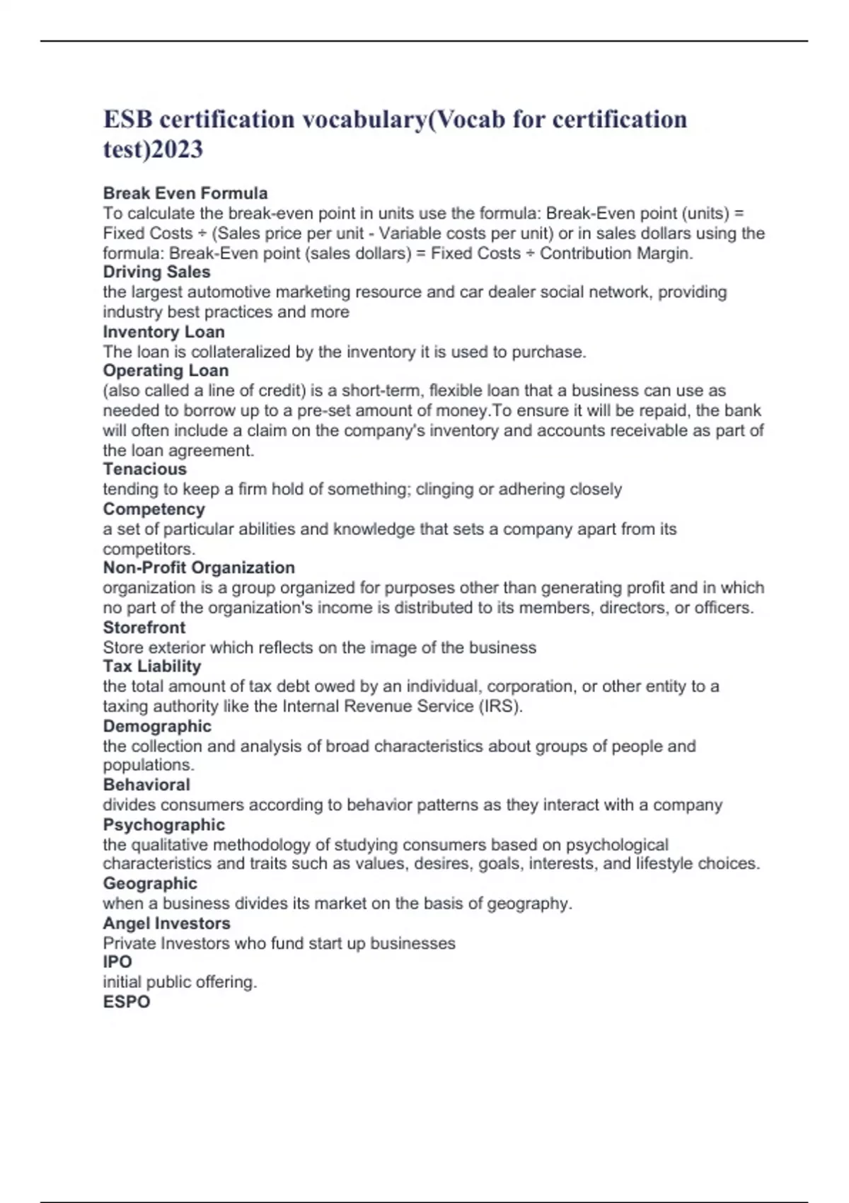 ESB certification vocabulary(Vocab for certification test)2023 Break Even Formula To calculate the break-even point in units use the formula: Break-Even point (units) = Fixed Costs ÷ (Sales price per unit - Variable costs per unit) or in sales dollars using the formula: Break-Even point (sales dollars) = Fixed Costs ÷ Contribution Margin. Driving Sales the largest automotive marketing resource and car dealer social network, providing industry best practices and more Inventory Loan The loan is collateralized by the inventory it is used to purchase. Operating Loan (also called a line of credit) is a short-term, flexible loan that a business can use as needed to borrow up to a pre-set amount of money.To ensure it will be repaid, the bank will often include a claim on the company's inventory and accounts receivable as part of the loan agreement. Tenacious tending to keep a firm hold of something; clinging or adhering closely Competency a set of particular abilities and knowledge that sets a company apart from its competitors. Non-Profit Organization organization is a group organized for purposes other than generating profit and in which no part of the organization's income is distributed to its members, directors, or officers. Storefront Store exterior which reflects on the image of the business Tax Liability the total amount of tax debt owed by an individual, corporation, or other entity to a taxing authority like the Internal Revenue Service (IRS). Demographic the collection and analysis of broad characteristics about groups of people and populations. Behavioral divides consumers according to behavior patterns as they interact with a company Psychographic the qualitative methodology of studying consumers based on psychological characteristics and traits such as values, desires, goals, interests, and lifestyle choices. Geographic when a business divides its market on the basis of geography. Angel Investors Private Investors who fund start up businesses IPO initial public offering. ESPO