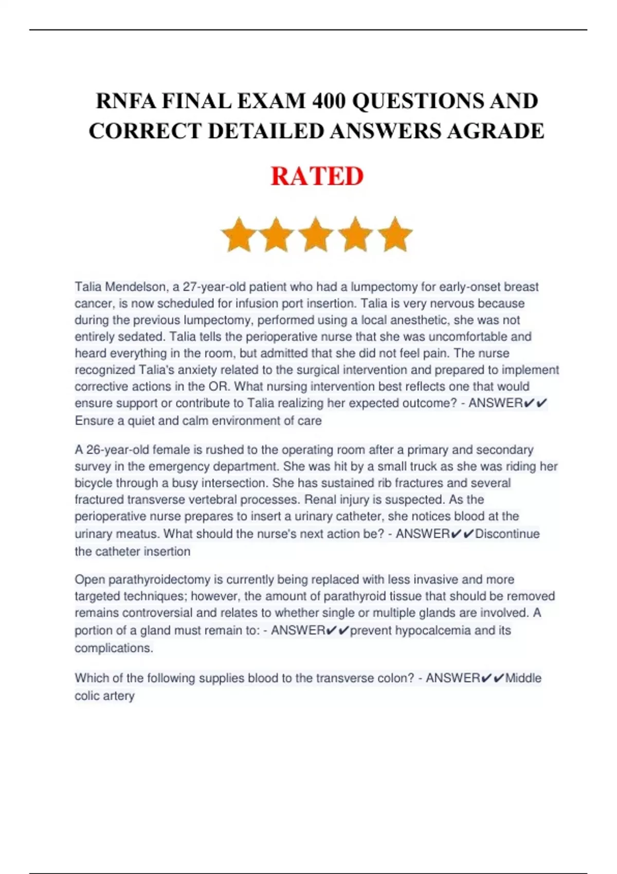 RNFA FINAL EXAM 400 QUESTIONS AND CORRECT DETAILED ANSWERS AGRADE.