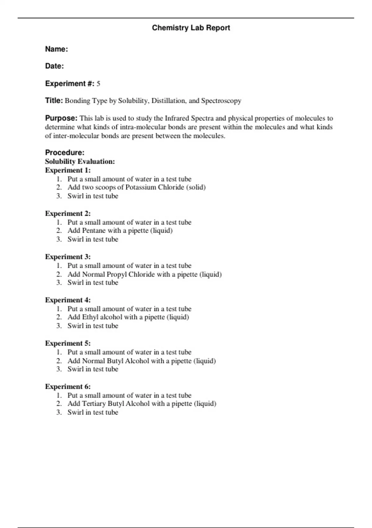 CHEM 121 Lab Report 5-Bonding Type by Solubility, Distillation, and Spectroscopy.