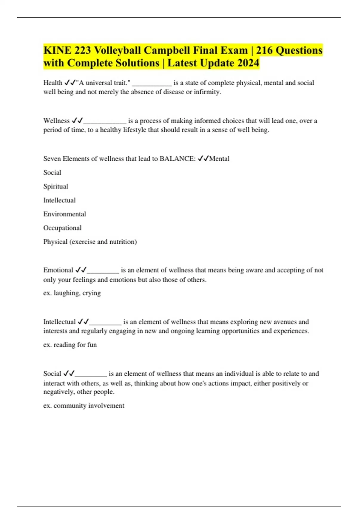 KINE 223 Volleyball Campbell Final Exam | 216 Questions with Complete Solutions | Latest Update 2024