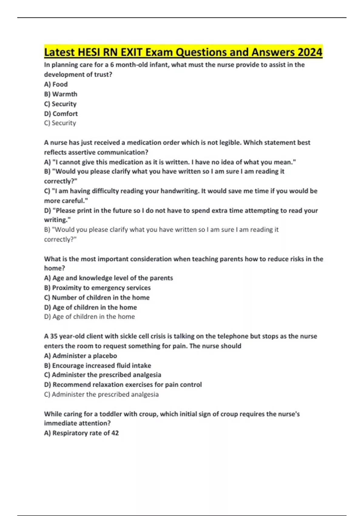 Latest HESI RN EXIT Exam Questions and Answers 2024