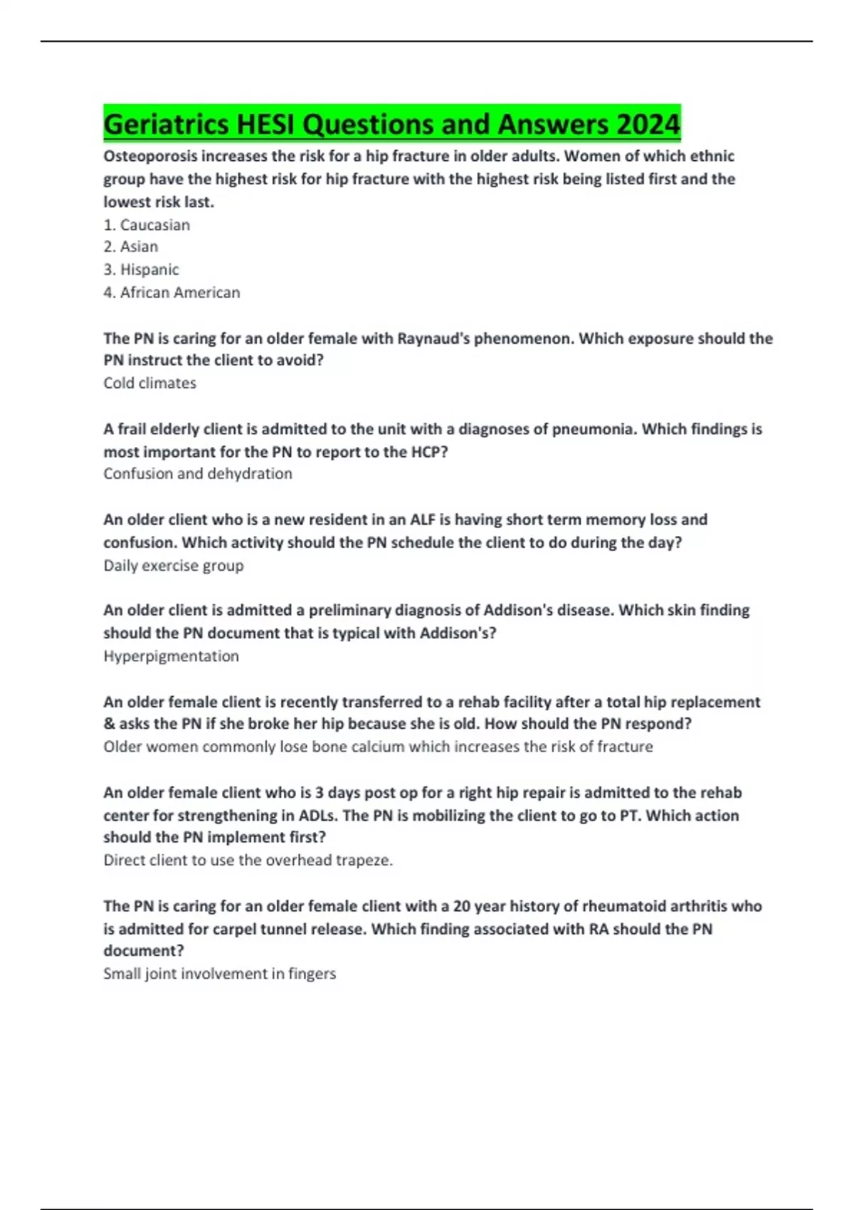 Geriatrics HESI Questions and Answers 2024