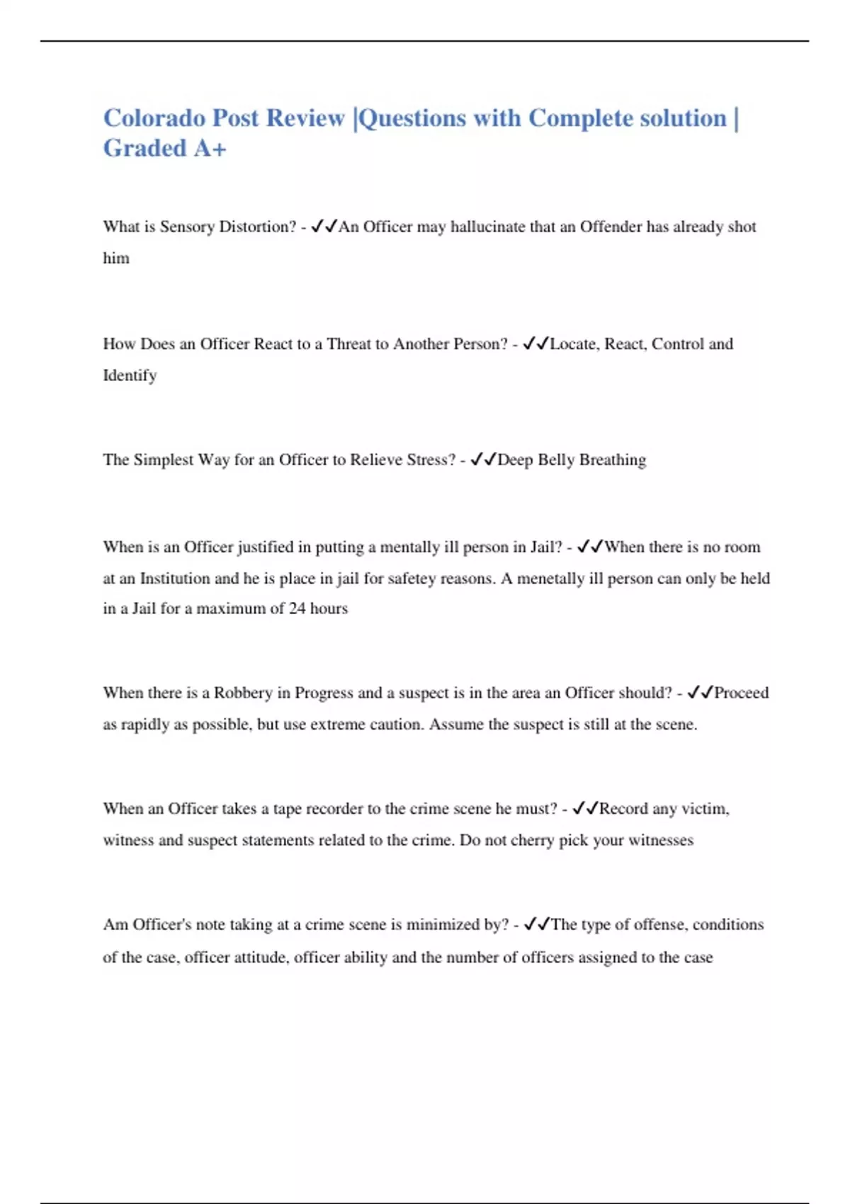 What is Sensory Distortion? - An Officer may hallucinate that an Offender has already shot him How Does an Officer React to a Threat to Another Person? - Locate, React, Control and Identify The Simplest Way for an Officer to Relieve Stress? - Deep Belly Breathing When is an Officer justified in putting a mentally ill person in Jail? - When there is no room at an Institution and he is place in jail for safetey reasons. A menetally ill person can only be held in a Jail for a maximum of 24 hours When there is a Robbery in Progress and a suspect is in the area an Officer should? - Proceed as rapidly as possible, but use extreme caution. Assume the suspect is still at the scene. When an Officer takes a tape recorder to the crime scene he must? - Record any victim, witness and suspect statements related to the crime. Do not cherry pick your witnesses