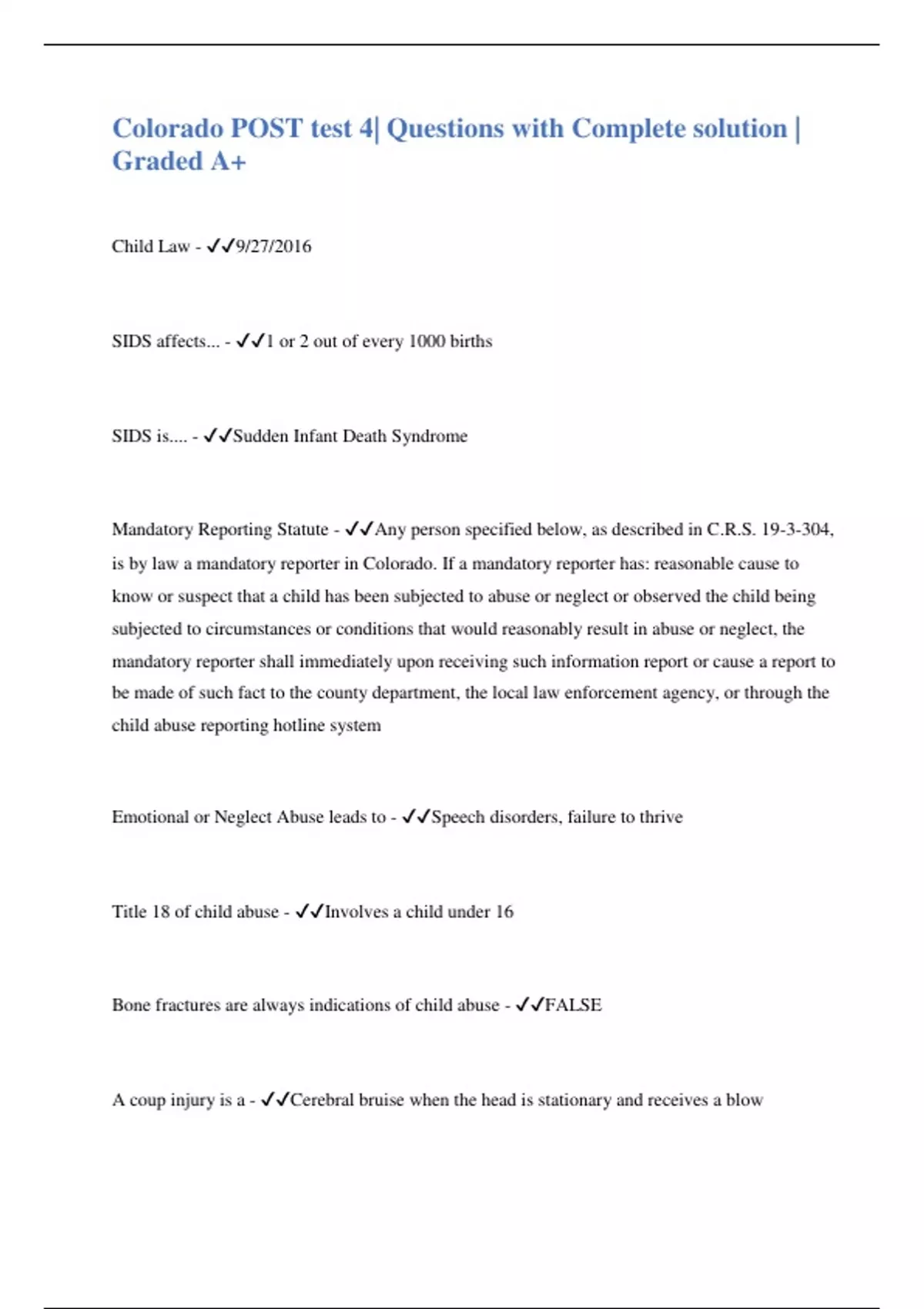 Child Law - 9/27/2016 SIDS affects... - 1 or 2 out of every 1000 births SIDS is.... - Sudden Infant Death Syndrome Mandatory Reporting Statute - Any person specified below, as described in C.R.S. 19-3-304, is by law a mandatory reporter in Colorado. If a mandatory reporter has: reasonable cause to know or suspect that a child has been subjected to abuse or neglect or observed the child being subjected to circumstances or conditions that would reasonably result in abuse or neglect, the mandatory reporter shall immediately upon receiving such information report or cause a report to be made of such fact to the county department, the local law enforcement agency, or through the child abuse reporting hotline system Emotional or Neglect Abuse leads to - Speech disorders, failure to thrive Title 18 of child abuse - Involves a child under 16 Bone fractures are always indications of child abuse - FALSE A coup injury is a - Cerebral bruise when the head is stationary and receives a blow