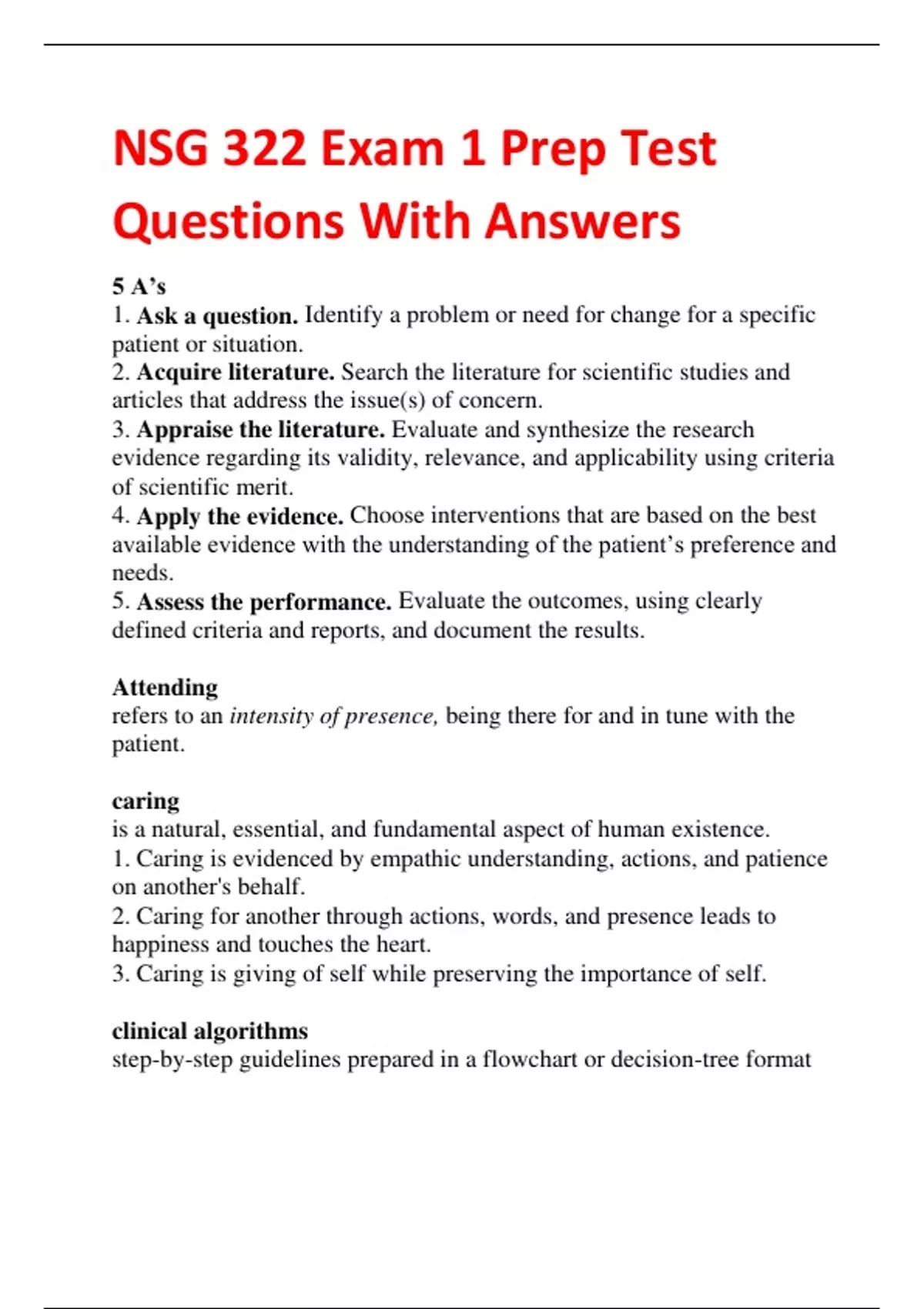 NSG 322 Exam 1 Prep Test Questions With Answers 5 A’s 1. Ask a question. Identify a problem or need for change for a specific patient or situation. 2. Acquire literature. Search the literature for scientific studies and articles that address the issue(s) of concern. 3. Appraise the literature. Evaluate and synthesize the research evidence regarding its validity, relevance, and applicability using criteria of scientific merit. 4. Apply the evidence. Choose interventions that are based on the best available evidence with the understanding of the patient’s preference and needs. 5. Assess the performance. Evaluate the outcomes, using clearly defined criteria and reports, and document the results. Attending refers to an intensity of presence, being there for and in tune with the patient. caring is a natural, essential, and fundamental aspect of human existence. 1. Caring is evidenced by empathic understanding, actions, and patience on another's behalf. 2. Caring for another through actions, words, and presence leads to happiness and touches the heart. 3. Caring is giving of self while preserving the importance of self. clinical algorithms step-by-step guidelines prepared in a flowchart or decision-tree format clinical/critical pathways serve as a "map" for specified treatments and interventions to occur within a specific time frame, often days. clinical practice guidelines recommendations based on evidence that serve as useful tools to direct clinical practice evidence-based practice (EBP) nursing care provided that is supported by sound scientific rationale patient advocate one who speaks for and protects the rights of the patient psychiatric-mental health nursing promoting mental health through the assessment, diagnosis, and treatment of human responses to mental health problems and psychiatric disorders Quality and Safety Education for Nurses (QSEN) addresses the challenge to prepare nurses with the competencies needed to continuously improve the quality of care in their work environments Therapeutic use of self ability to use one's personality consciously and in full awareness in an attempt to establish relatedness and to structure nursing interventions trauma-informed care an approach to treatment that acknowledges the role that trauma can have on the mental health of individuals culture-bound syndromes (or culture-related syndromes) appear only in particular cultures and do not appear globally in all societies or parts of the world. Diagnostic and Statistical Manual of Mental Disorders, 5th edition (DSM-5) Manual where the mental disorders are clinically significant behavioral or psychological syndromes or patterns that occur in an individual with distress or disability disability impairment in one or more important areas of functioning distress, painful symptom epidemiology studies the distribution (numbers of cases) of disorders in human populations. mental disorders Health conditions characterized by alterations in thinking, mood, or behavior associated with distress and/or impaired functioning mental health multifaceted and involves our emotional, psychological, and social wellbeing. mental illness a disorder that affects a person's thoughts, emotions, and beha
