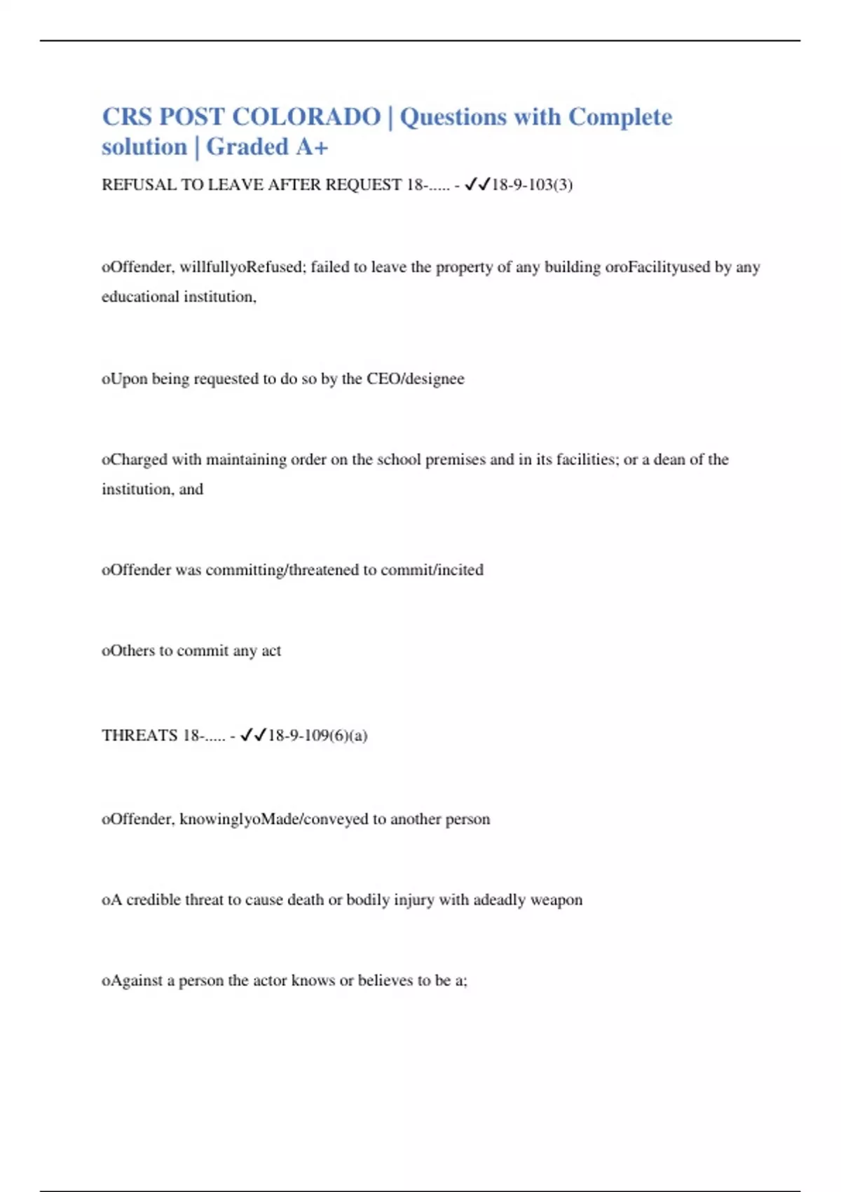 REFUSAL TO LEAVE AFTER REQUEST 18-..... - 18-9-103(3) oOffender, willfullyoRefused; failed to leave the property of any building oroFacilityused by any educational institution, oUpon being requested to do so by the CEO/designee oCharged with maintaining order on the school premises and in its facilities; or a dean of the institution, and oOffender was committing/threatened to commit/incited oOthers to commit any act THREATS 18-..... - 18-9-109(6)(a) oOffender, knowinglyoMade/conveyed to another person oA credible threat to cause death or bodily injury with adeadly weapon oAgainst a person the actor knows or believes to be a;