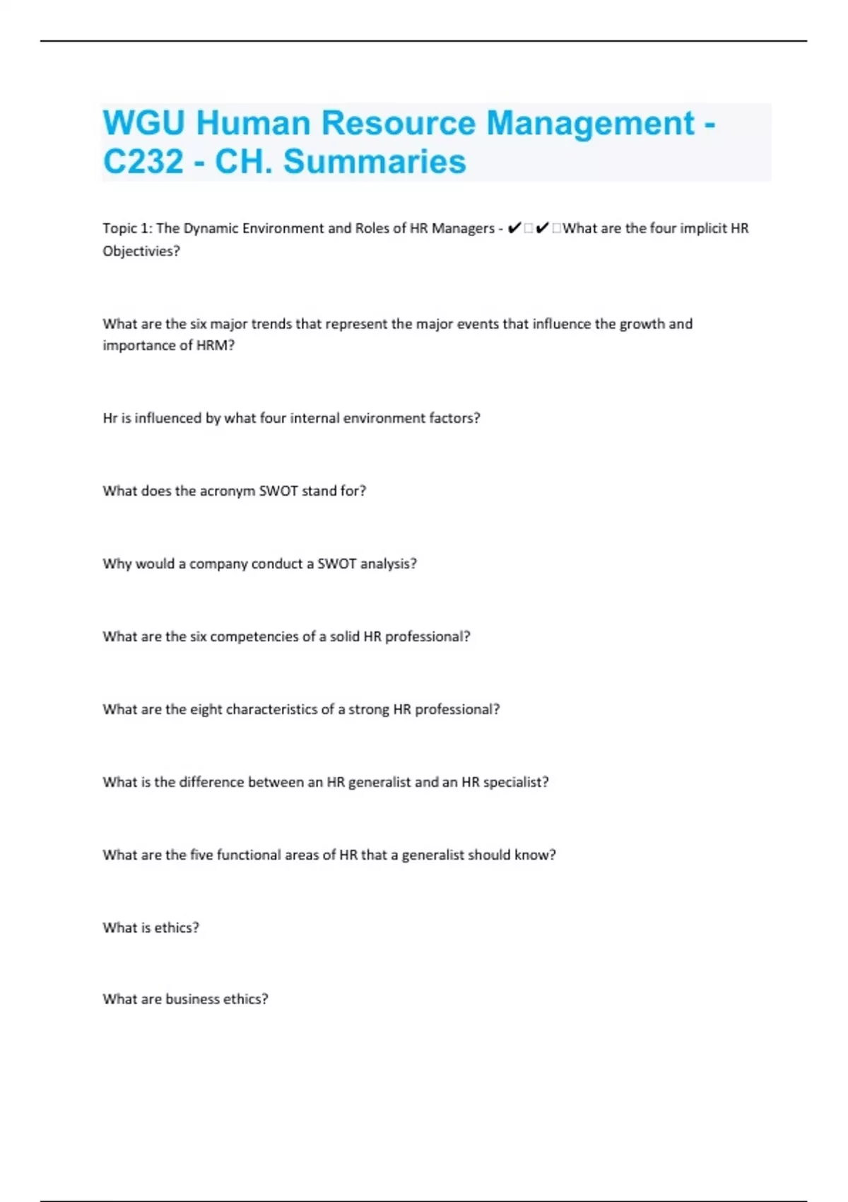 What are the five functional areas of HR that a generalist should know? What is ethics? What are business ethics? Why are ethics important in human resource administration? What Are the Four Implicit HR Objectivies? - ️️1. Improve productivity 2.Improve quality of work 3. Ensure legal compliance 4. Ensure ethical behavior What are the six major trends that represent the major events that influence the growth and importance of HRM? - ️️1. competition 2. costs and benefits 3. Productivity 4. social, cultural, legal, demographic, and educational changes 5. dysfunction in the workplace 6. Societal trends century Hr is influenced by what four internal environment factors? - ️️1. Culture; shaped by top management values 2. Technology; refers to the firm's equipment and knowledge 3. Organizational structure 4. Orgainizational size What does the acronym SWOT stand for? - ️️Strenths, Weaknesses, Opportunities, and Threats Why would a company conduct a SWOT analysis? - ️️Allows leadership to assess the firm's internal abilities and vulnerabilities to the external environment