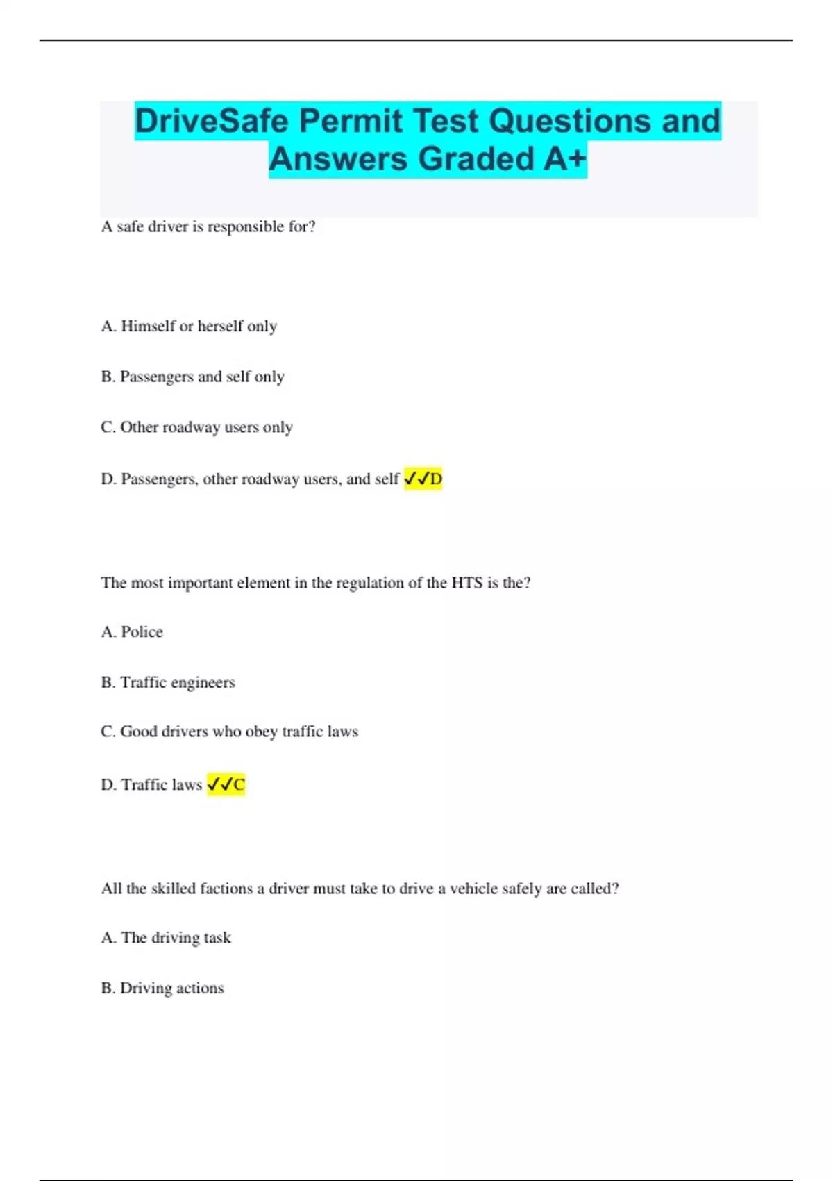 DriveSafe Permit Test Questions and Answers Graded A+ A safe driver is responsible for? A. Himself or herself only B. Passengers and self only C. Other roadway users only D. Passengers, other roadway users, and self D The most important element in the regulation of the HTS is the? A. Police B. Traffic engineers C. Good drivers who obey traffic laws D. Traffic laws C All the skilled factions a driver must take to drive a vehicle safely are called? A. The driving task B. Driving actions C. Judging time-space relationships D. Interpreting traffic scenes A How many points are attached to your driver's license during the first 12 months? A. 6 B. 8 C. None D. 4 A The four steps in the IPDE process are? A. Identify, predict, discover, execute B. Identify, predict, decide, execute C. Identify, predict, delay, estimate D. Identify, prepare, defend, estimate B What is the most common cause of most collisions? A. Driver error B. Bad roadways C. Defective vehicles D. Heavy traffic A Protecting yourself and others while driving means you are practicing? A. Obeying natural laws B. Preventive maintenance C. Offensive driving D. Defensive driving D Which of the following driver reactions is NOT that of a defensive driver? A. Adjusts to changing weather and roadway conditions B. Anticipates actions of other roadway users C. Tries to avoid conflict D. Pays little attention to other roadway users D Most states have laws requiring drivers to be financially responsible to pay for? A. Fuel to get to their destination safely B. Vehicle repairs caused by their own negligence C. Property damage and injuries they cause to other people D. Vehicle loans needed to replace their damaged vehicles C What is something you might not first consider part of the HTS? A. The light rail B. An airplane C. A railroad train D. A skateboard A A driver who refuses to take a breathalyzer test may