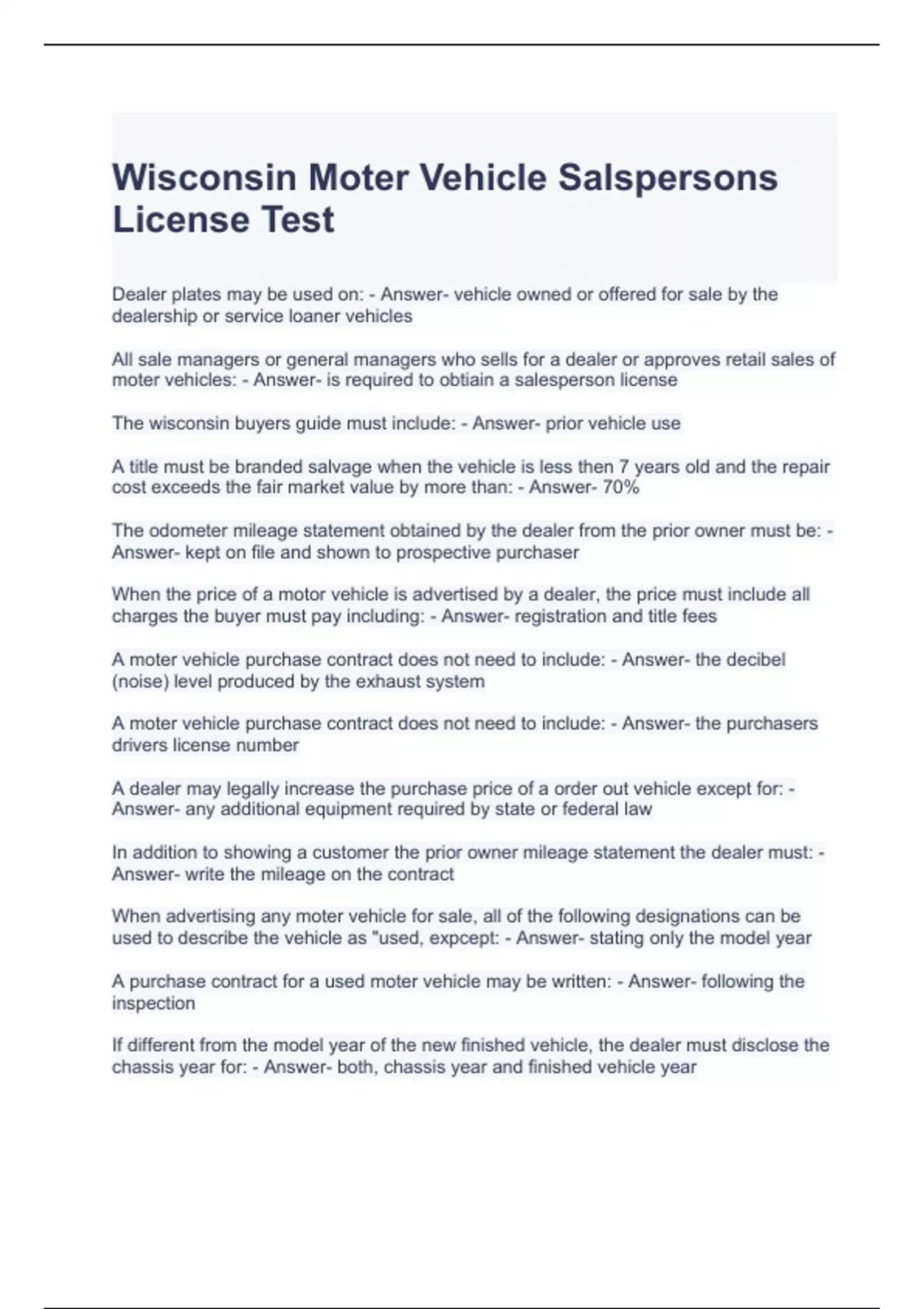Wisconsin Moter Vehicle Salspersons License Test Questions and Answers