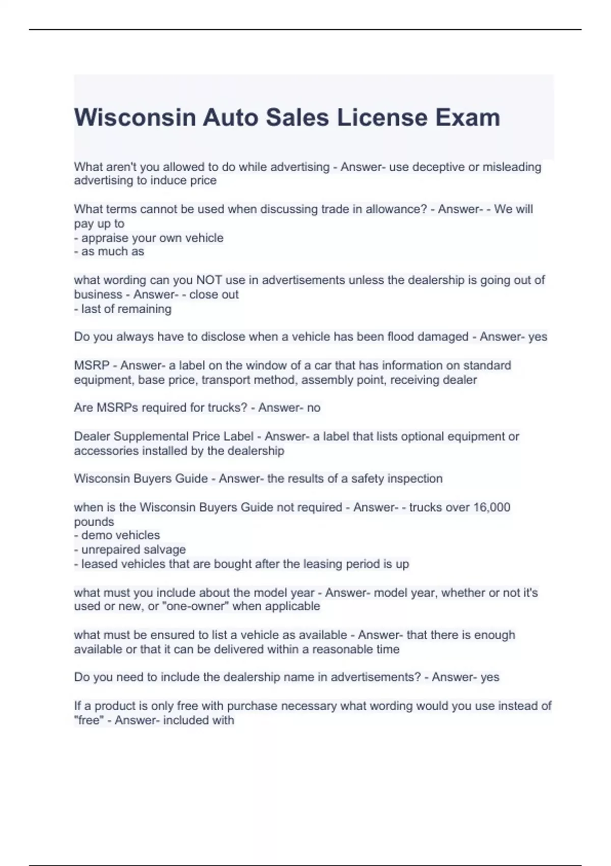 Wisconsin Auto Sales License Exam Questions and Answers