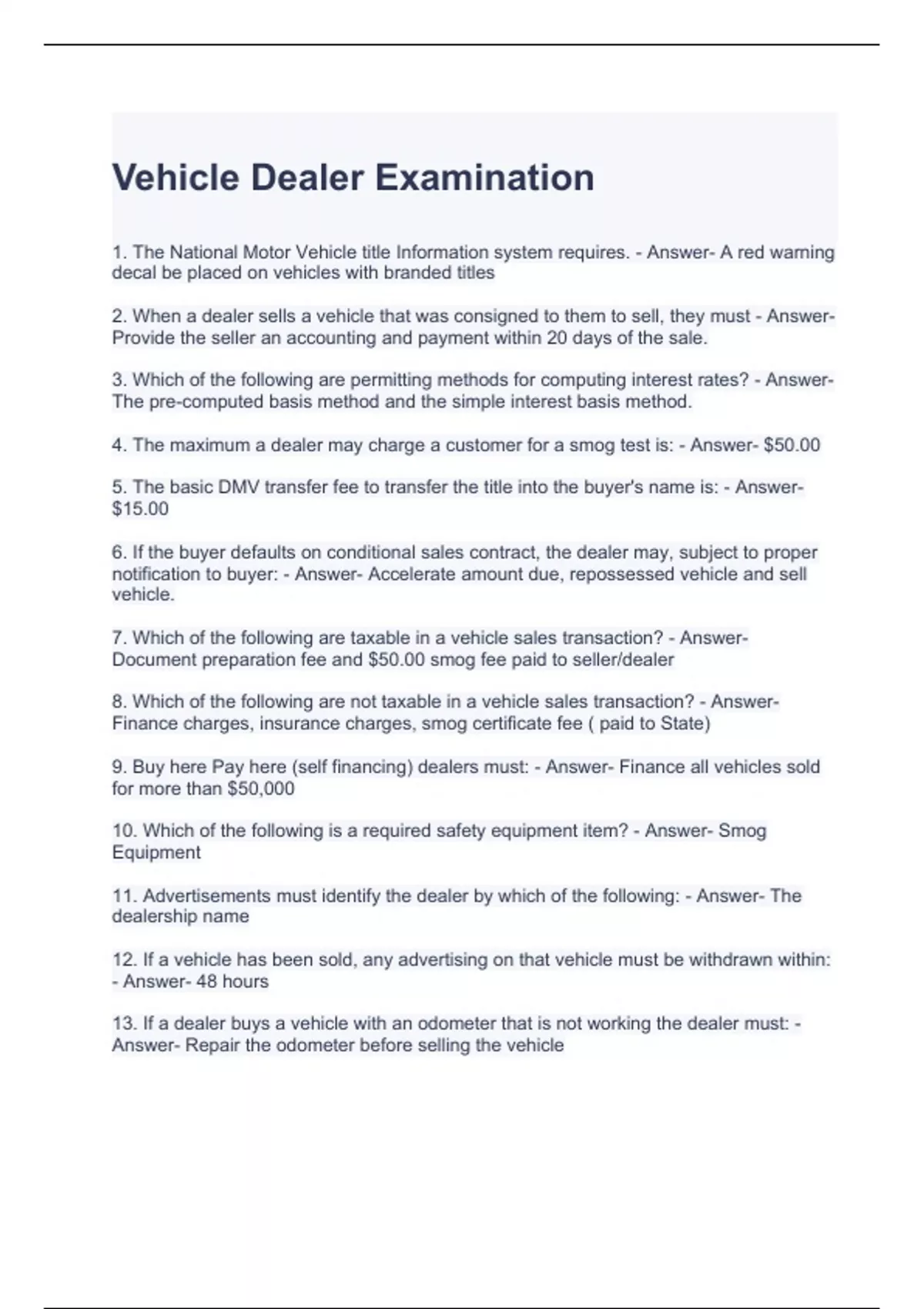 Vehicle Dealer Examination Questions and Answers