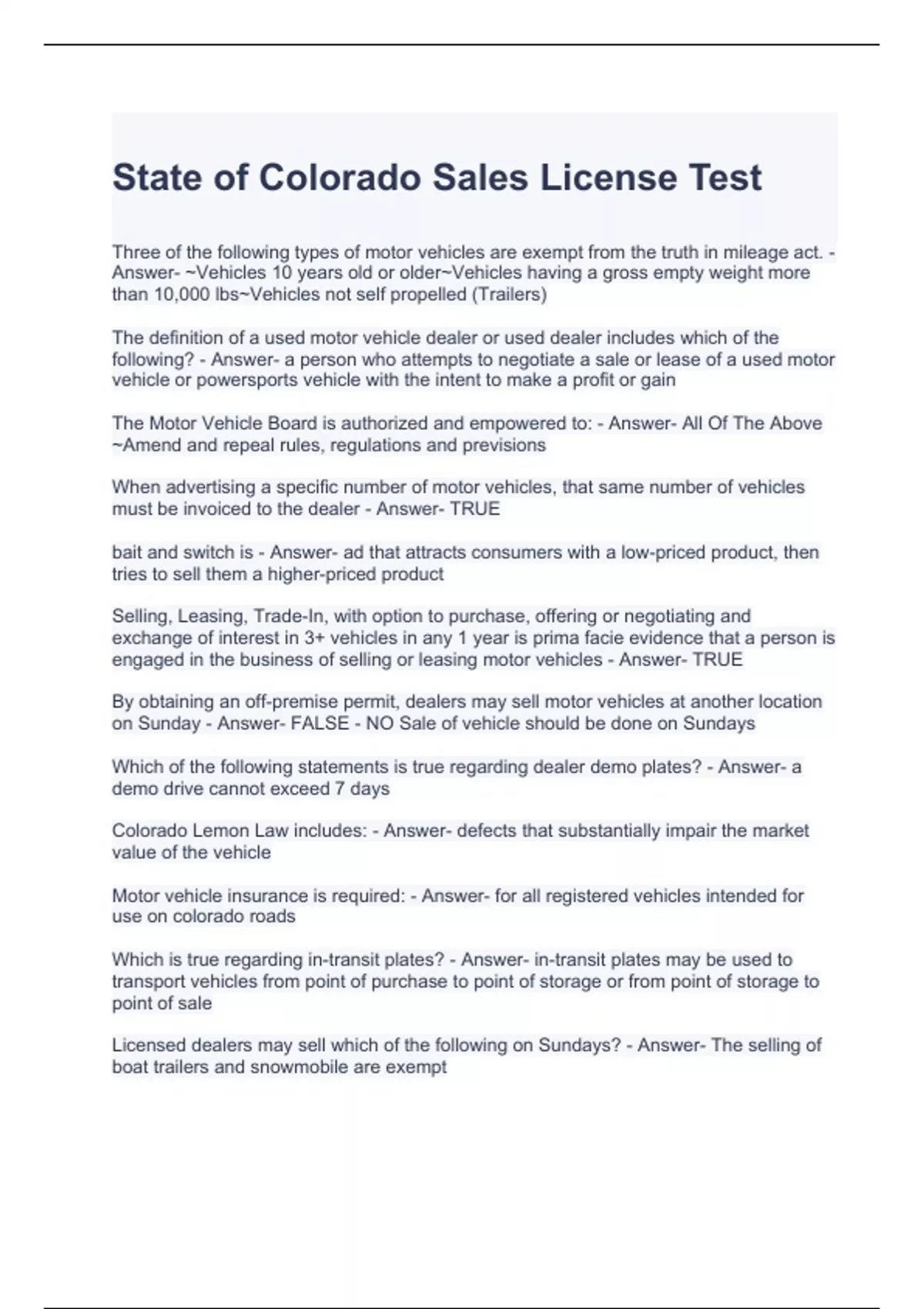 State of Colorado Sales License Test Questions and Answers