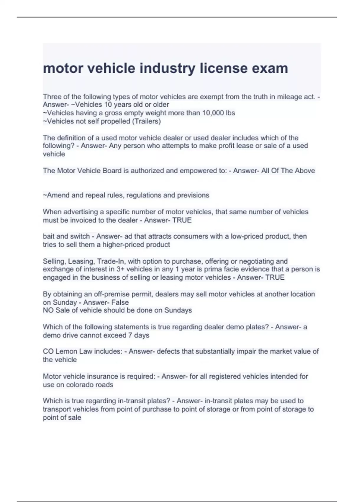 motor vehicle industry license exam questions and answers
