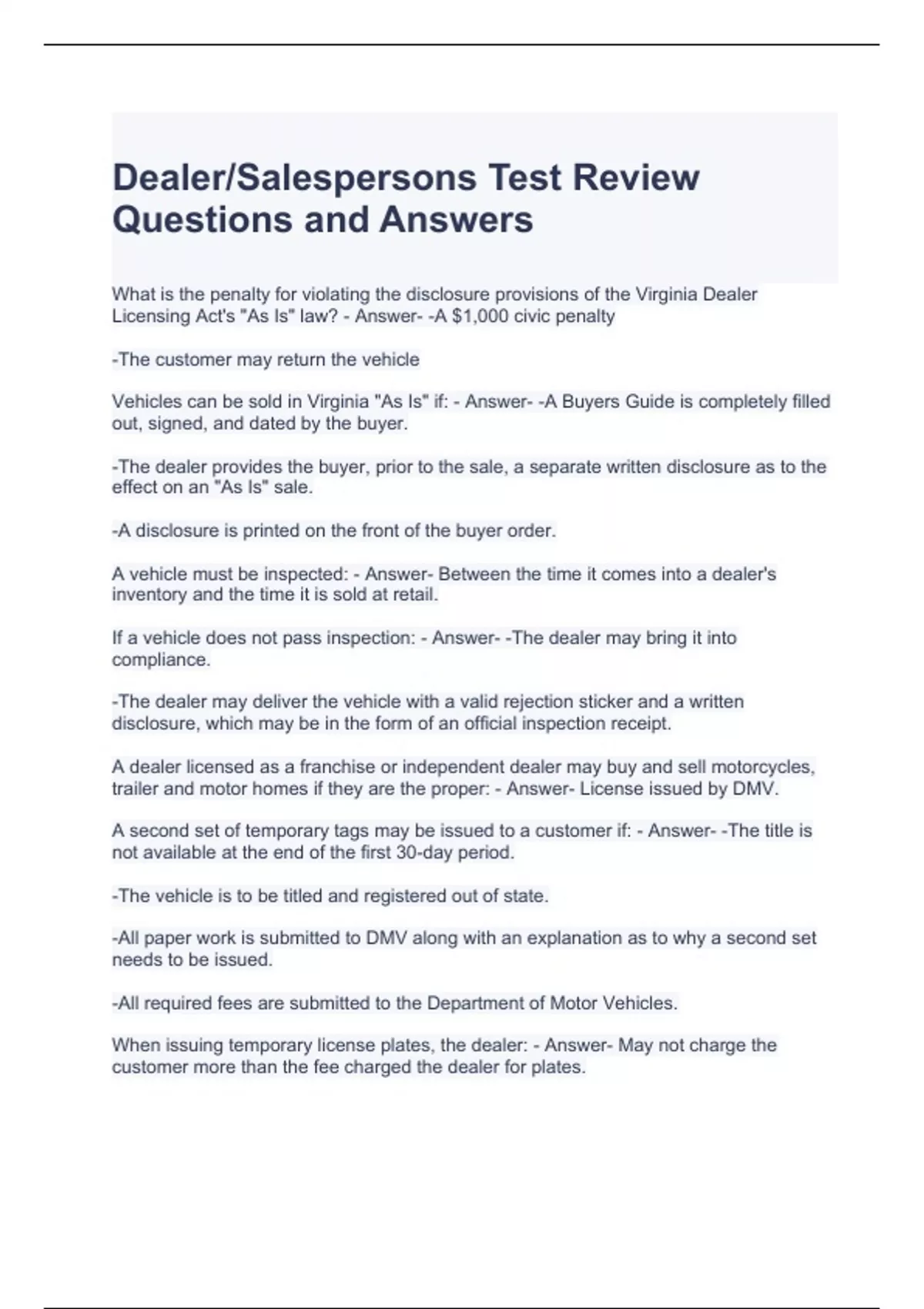 Dealer-Salespersons Test Review Questions and Answers