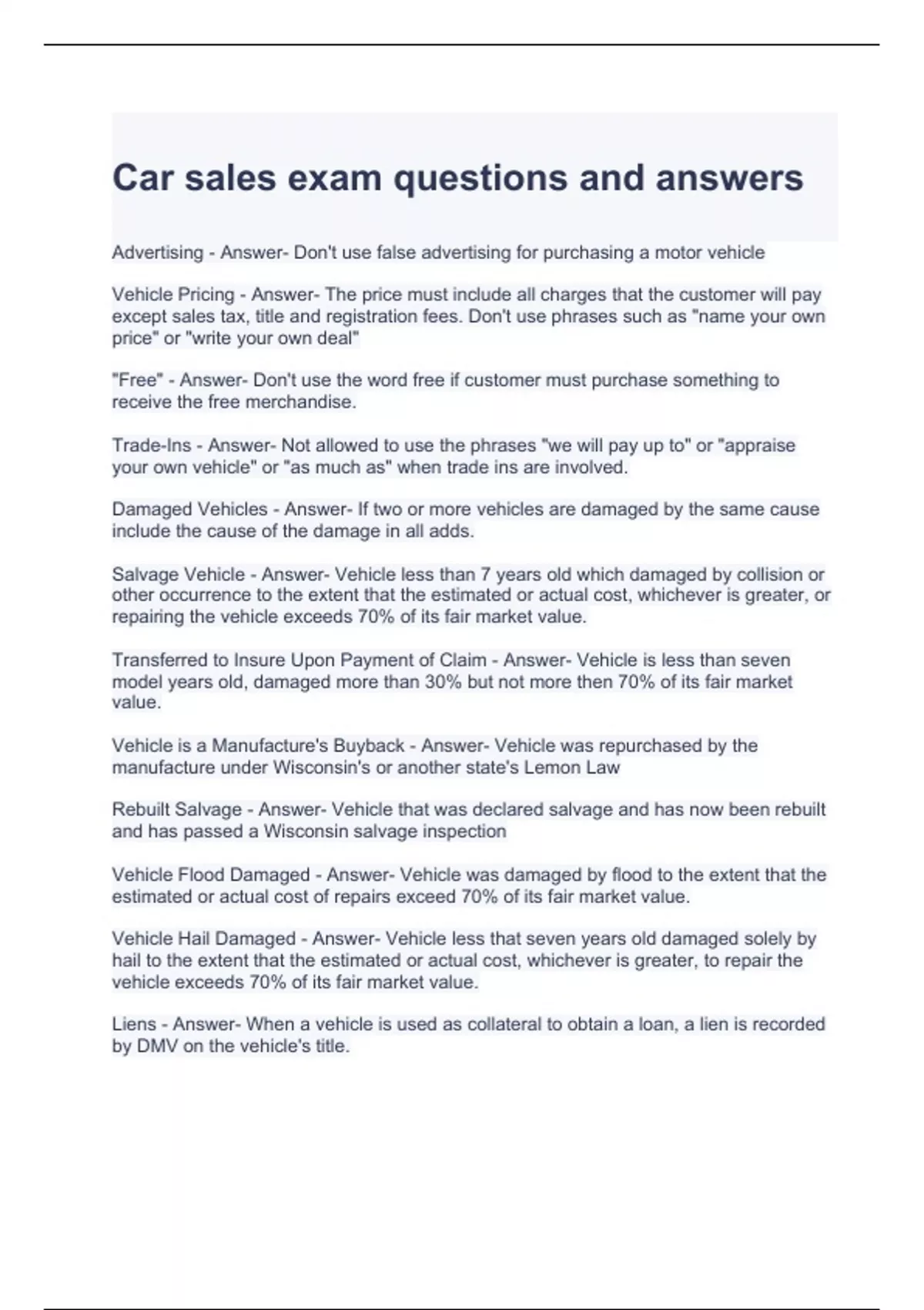 Car sales exam questions and answers
