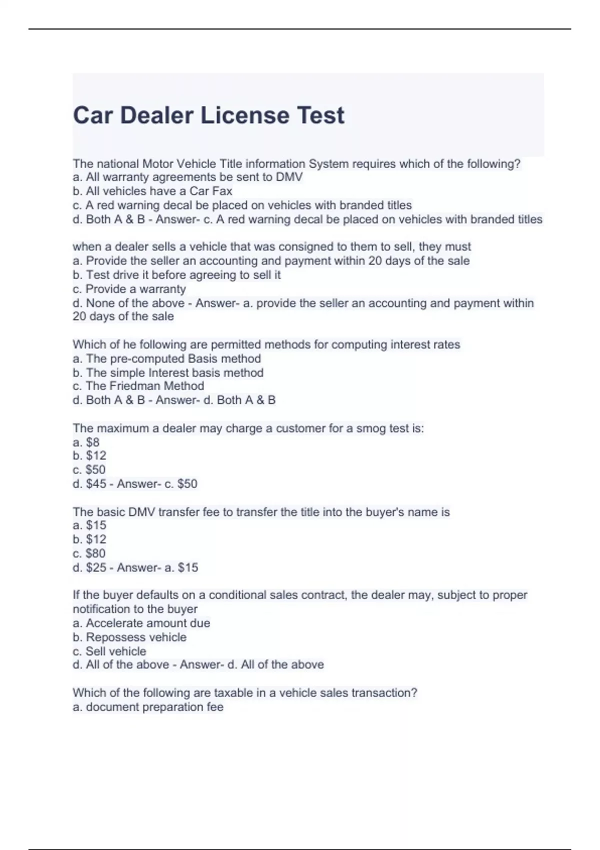 Car Dealer License Test 100% Solved