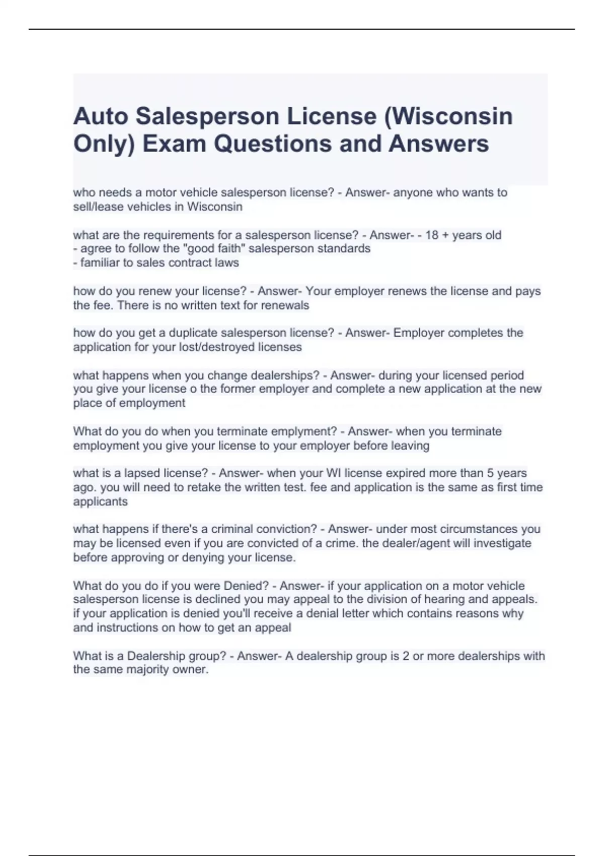 Auto Salesperson License (Wisconsin Only) Exam Questions and Answers