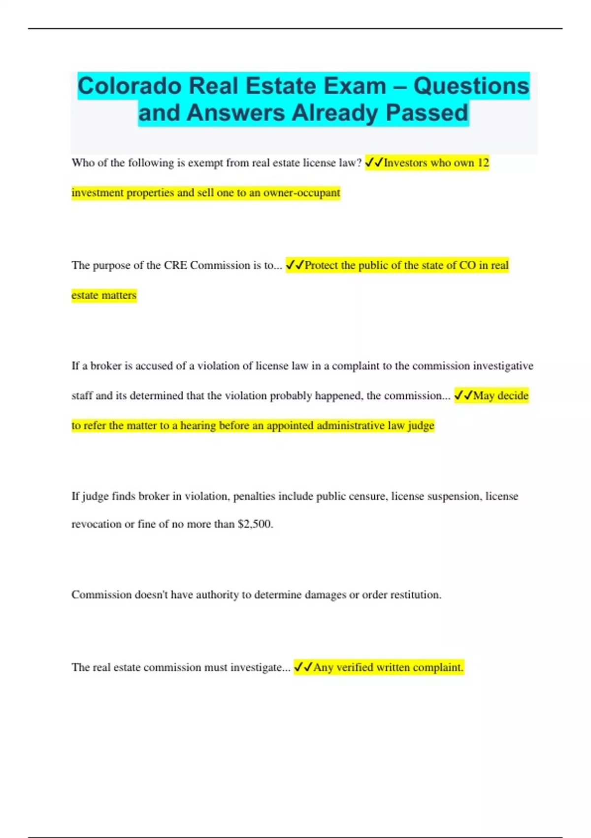Colorado Real Estate Exam – Questions and Answers Already Passed