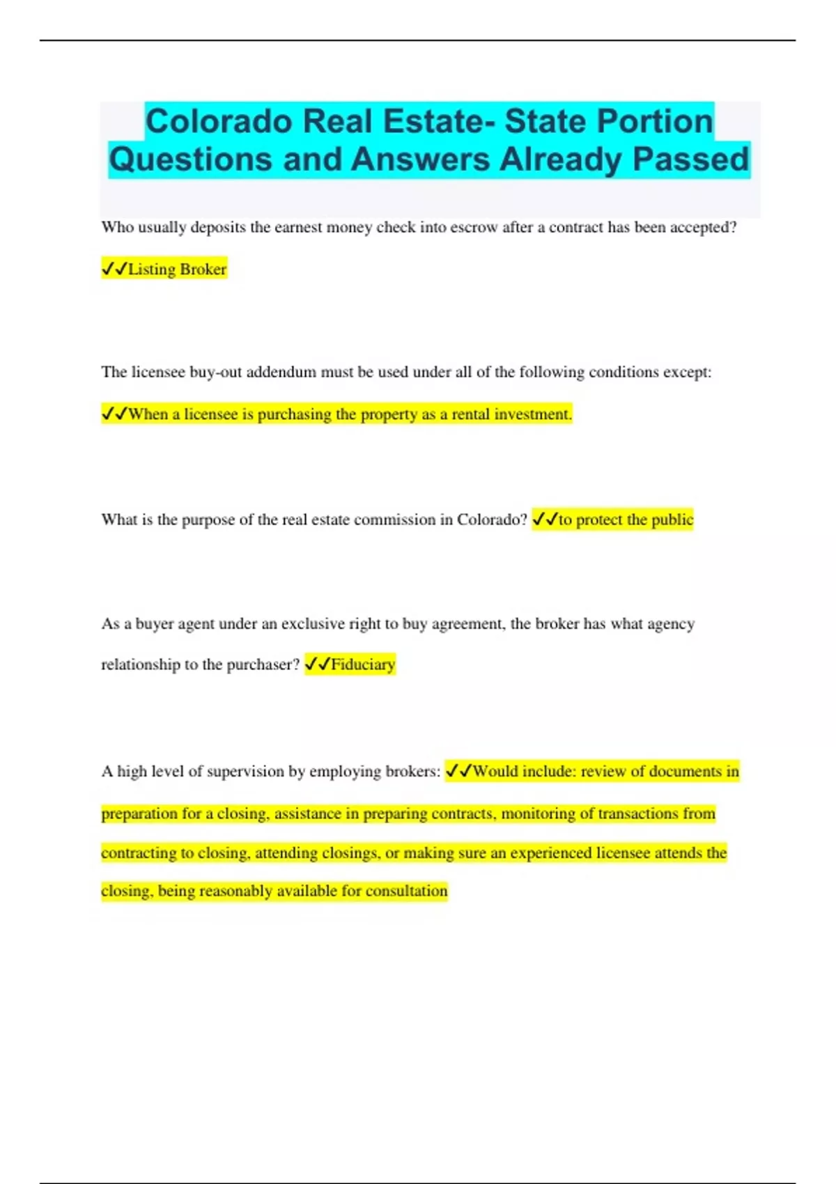 Colorado Real Estate- State Portion Questions and Answers Already Passed