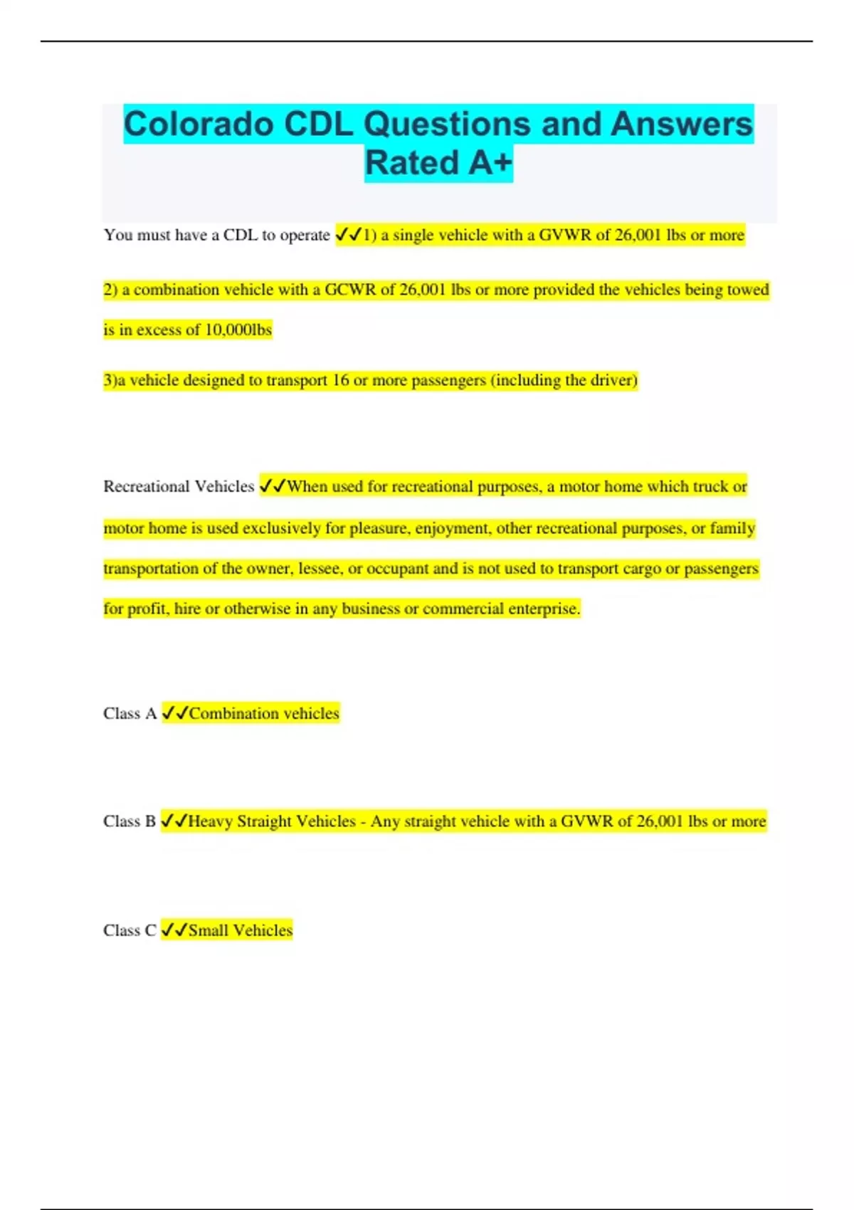 Colorado CDL Questions and Answers Rated A+