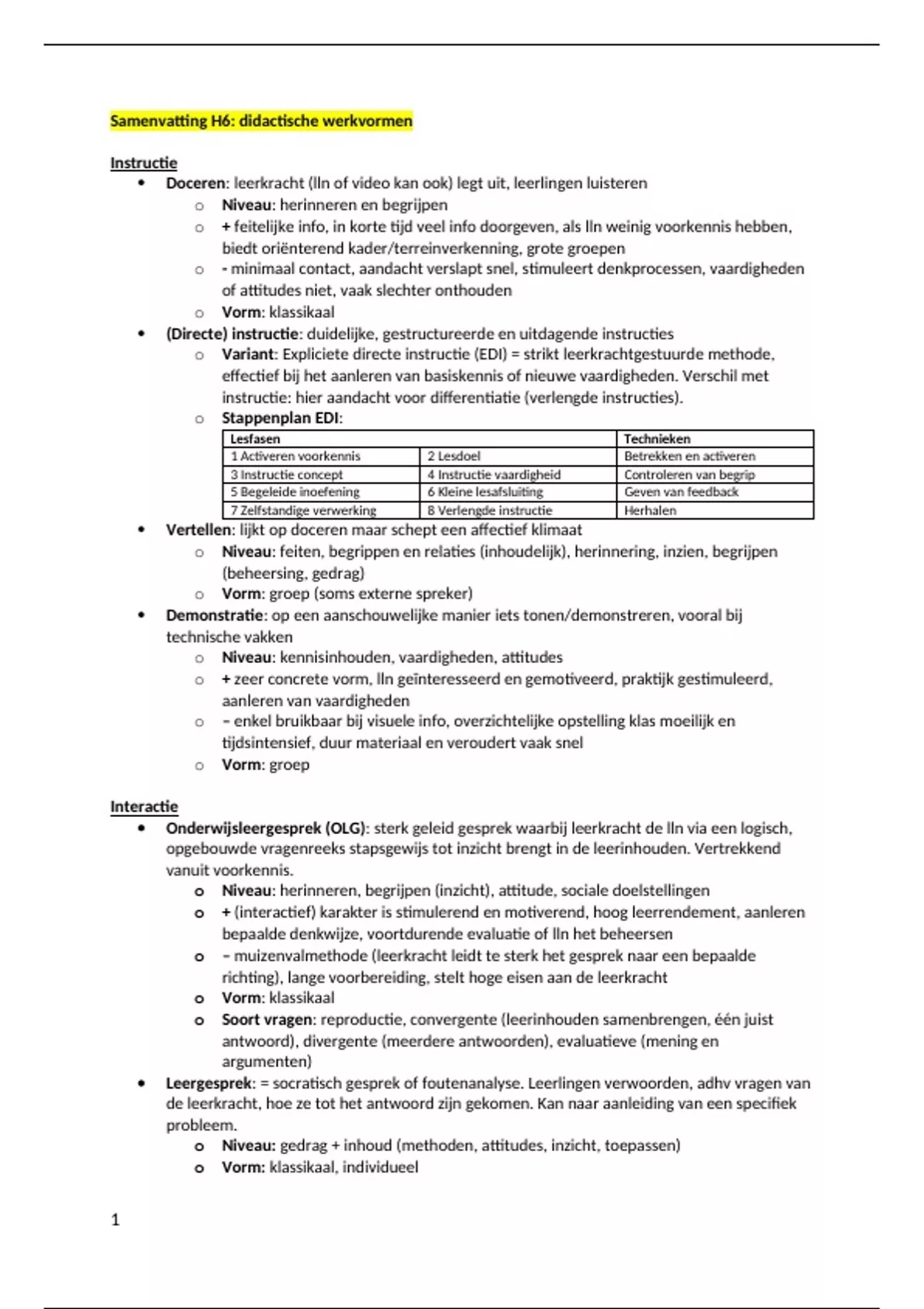 Dit is van de cursus Doelgericht werken en evalueren (voor vakdidactiek cluster gedrag en maatschappij) . Het is het hoofdstuk 6 samengevat en een overzicht gemaakt van de verschillende werkvormen. Ideaal om kort te herhalen
