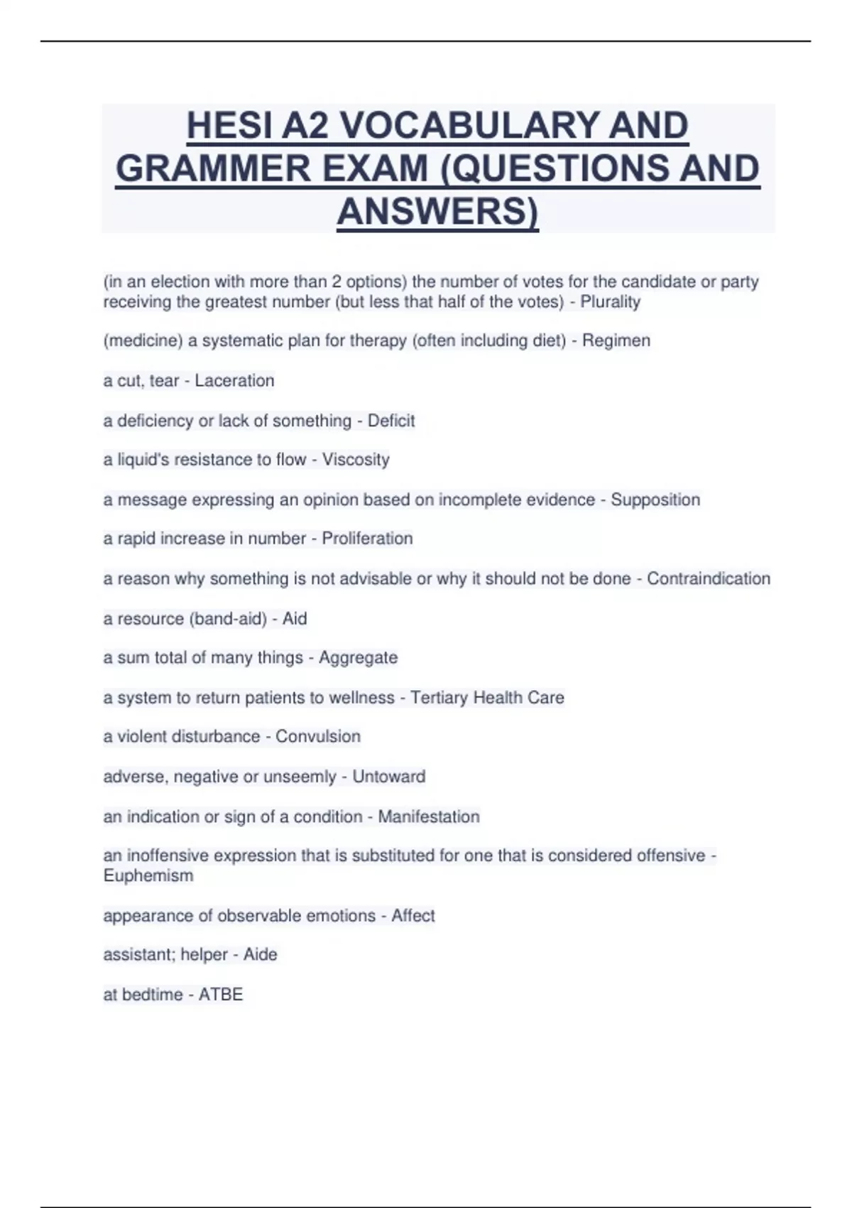 HESI A2 VOCABULARY AND GRAMMER EXAM (QUESTIONS AND ANSWERS) (in an election with more than 2 options) the number of votes for the candidate or party receiving the greatest number (but less that half of the votes) - Plurality (medicine) a systematic plan for therapy (often including diet) - Regimen a cut, tear - Laceration a deficiency or lack of something - Deficit a liquid's resistance to flow - Viscosity a message expressing an opinion based on incomplete evidence - Supposition a rapid increase in number - Proliferation a reason why something is not advisable or why it should not be done - Contraindication a resource (band-aid) - Aid a sum total of many things - Aggregate a system to return patients to wellness - Tertiary Health Care a violent disturbance - Convulsion adverse, negative or unseemly - Untoward an indication or sign of a condition - Manifestation an inoffensive expression that is substituted for one that is considered offensive - Euphemism appearance of observable emotions - Affect assistant; helper - Aide at bedtime - ATBE