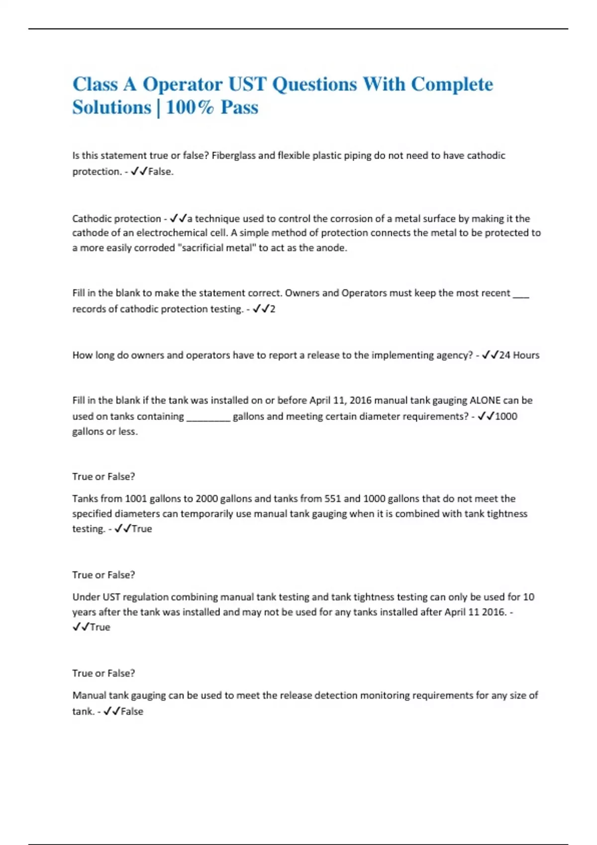 Is this statement true or false? Fiberglass and flexible plastic piping do not need to have cathodic protection. - False. Cathodic protection - a technique used to control the corrosion of a metal surface by making it the cathode of an electrochemical cell. A simple method of protection connects the metal to be protected to a more easily corroded "sacrificial metal" to act as the anode. Fill in the blank to make the statement correct. Owners and Operators must keep the most recent ___ records of cathodic protection testing. - 2 How long do owners and operators have to report a release to the implementing agency? - 24 Hours Fill in the blank if the tank was installed on or before April 11, 2016 manual tank gauging ALONE can be used on tanks containing ________ gallons and meeting certain diameter requirements? - 1000 gallons or less. True or False? Tanks from 1001 gallons to 2000 gallons and tanks from 551 and 1000 gallons that do not meet the specified diameters can temporarily use manual tank gauging when it is combined with tank tightness testing. - True True or False? Under UST regulation combining manual tank testing and tank tightness testing can only be used for 10 years after the tank was installed and may not be used for any tanks installed after April 11 2016. - True