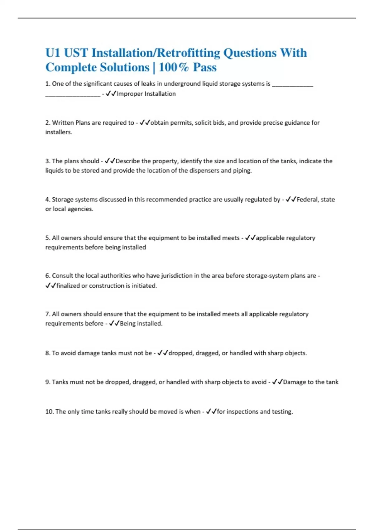 U1 UST Installation/Retrofitting Questions With Complete Solutions | 100% Pass