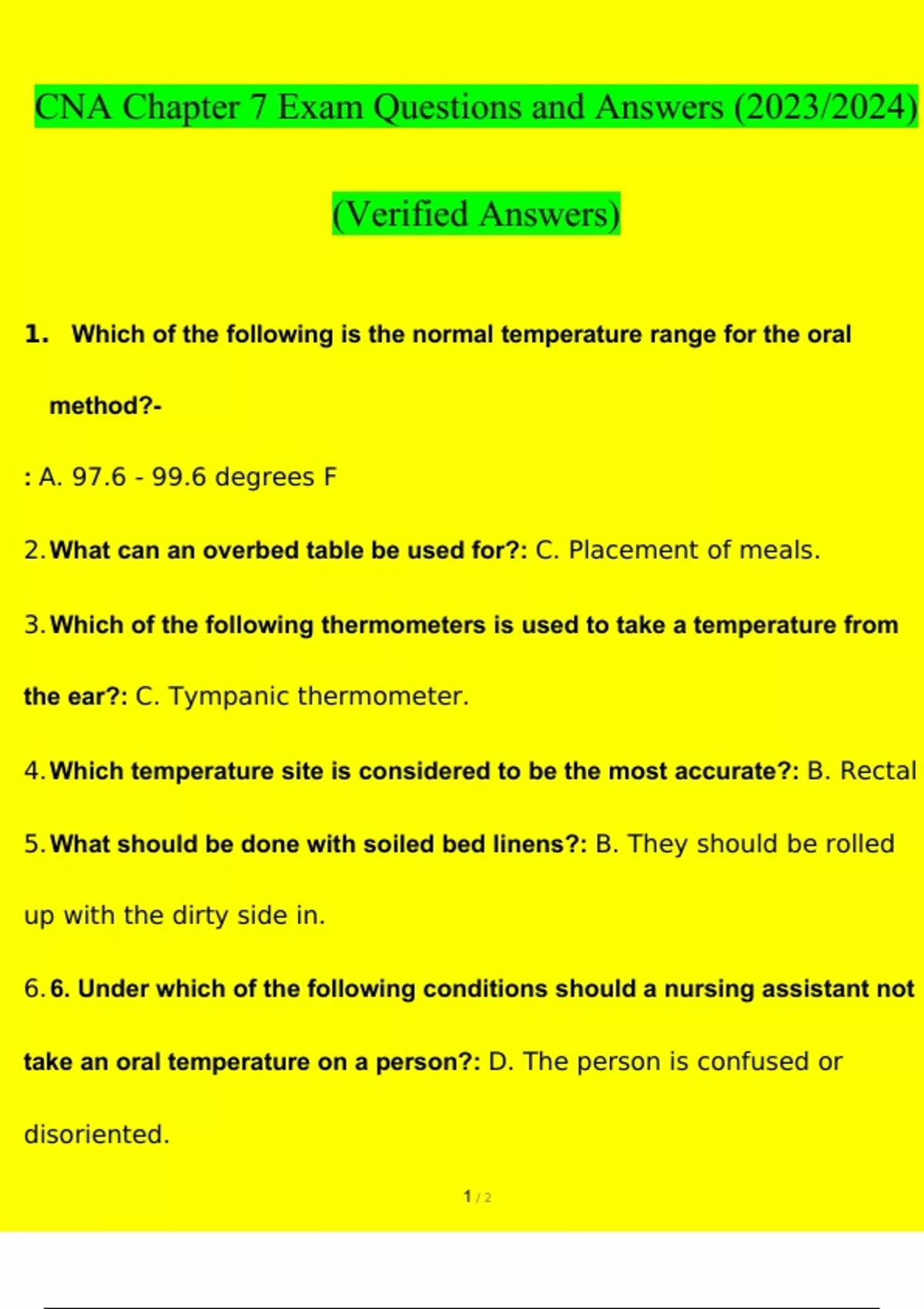 CNA Chapter 7 Exam Questions and Answers