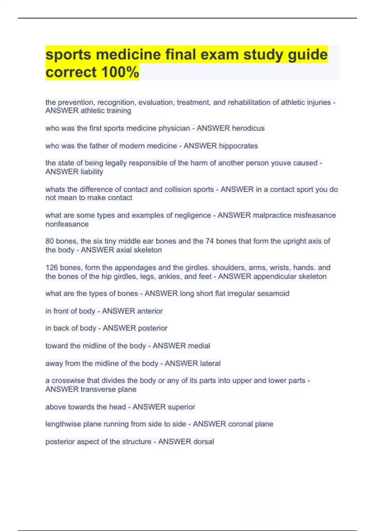 sports medicine final exam studythe prevention, recognition, evaluation, treatment, and rehabilitation of athletic injuries - ANSWER athletic training who was the first sports medicine physician - ANSWER herodicus who was the father of modern medicine - ANSWER hippocrates the state of being legally responsible of the harm of another person youve caused - ANSWER liability whats the difference of contact and collision sports - ANSWER in a contact sport you do not mean to make contact what are some types and examples of negligence - ANSWER malpractice misfeasance nonfeasance 80 bones, the six tiny middle ear bones and the 74 bones that form the upright axis of the body - ANSWER axial skeleton 126 bones, form the appendages and the girdles. shoulders, arms, wrists, hands. and the bones of the hip girdles, legs, ankles, and feet - ANSWER appendicular skeleton what are the types of bones - ANSWER long short flat irregular sesamoid in front of body - ANSWER anterior in back of body - ANSWER posterior guide correct 100%