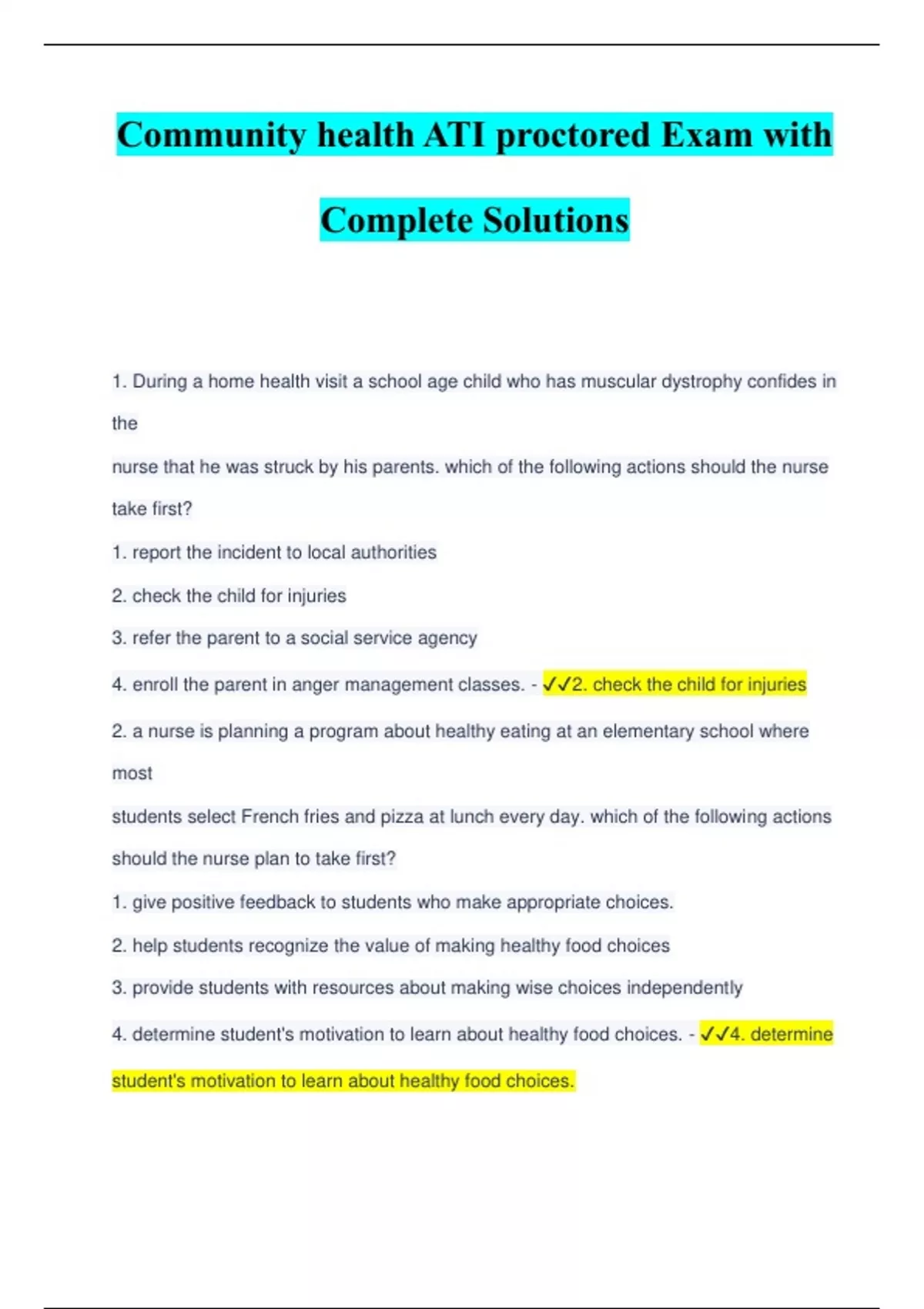 community health ati proctored exam with complete
