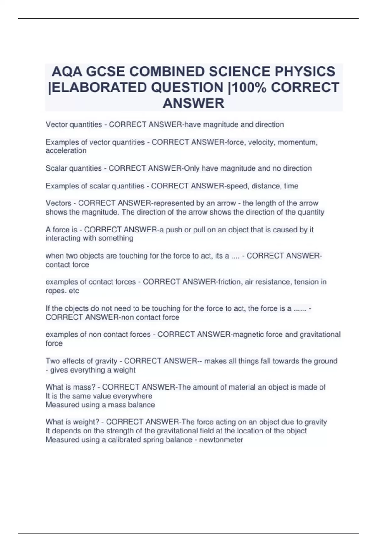 AQA GCSE COMBINED SCIENCE PHYSICS |ELABORATED QUESTION |100% CORRECT ANSWER Vector quantities - CORRECT ANSWER-have magnitude and direction Examples of vector quantities - CORRECT ANSWER-force, velocity, momentum, acceleration Scalar quantities - CORRECT ANSWER-Only have magnitude and no direction Examples of scalar quantities - CORRECT ANSWER-speed, distance, time