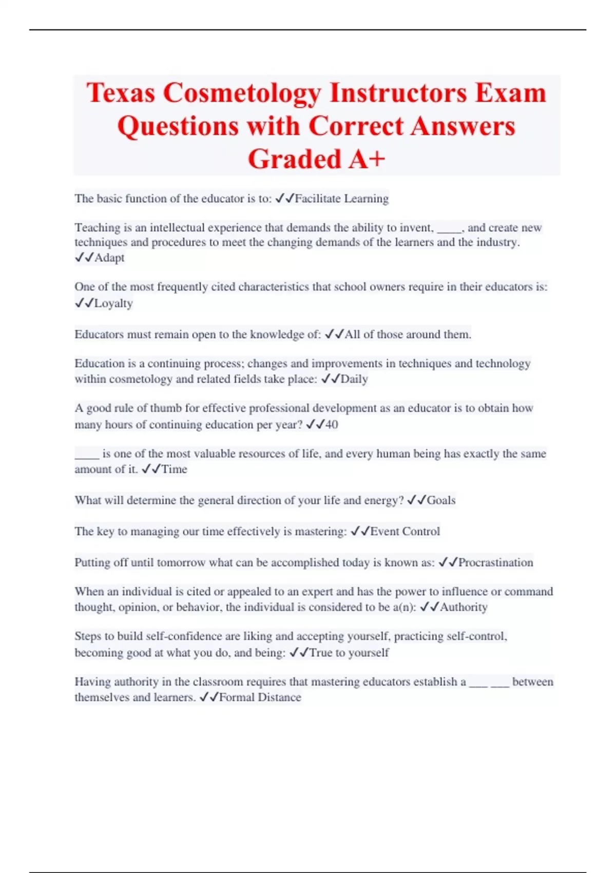 Texas Cosmetology Instructors Exam Questions with Correct Answers Graded A+ The basic function of the educator is to: Facilitate Learning Teaching is an intellectual experience that demands the ability to invent, ____, and create new techniques and procedures to meet the changing demands of the learners and the industry. Adapt One of the most frequently cited characteristics that school owners require in their educators is: Loyalty Educators must remain open to the knowledge of: All of those around them. Education is a continuing process; changes and improvements in techniques and technology within cosmetology and related fields take place: Daily A good rule of thumb for effective professional development as an educator is to obtain how many hours of continuing education per year? 40 ____ is one of the most valuable resources of life, and every human being has exactly the same amount of it. Time What will determine the general direction of your life and energy? Goals The key to managing our time effectively is mastering: Event Control Putting off until tomorrow what can be accomplished today is known as: Procrastination When an individual is cited or appealed to an expert and has the power to influence or command thought, opinion, or behavior, the individual is considered to be a(n): Authority Steps to build self-confidence are liking and accepting yourself, practicing self-control, becoming good at what you do, and being: True to yourself Having authority in the classroom requires that mastering educators establish a ___ ___ between themselves and learners. Formal Distance
