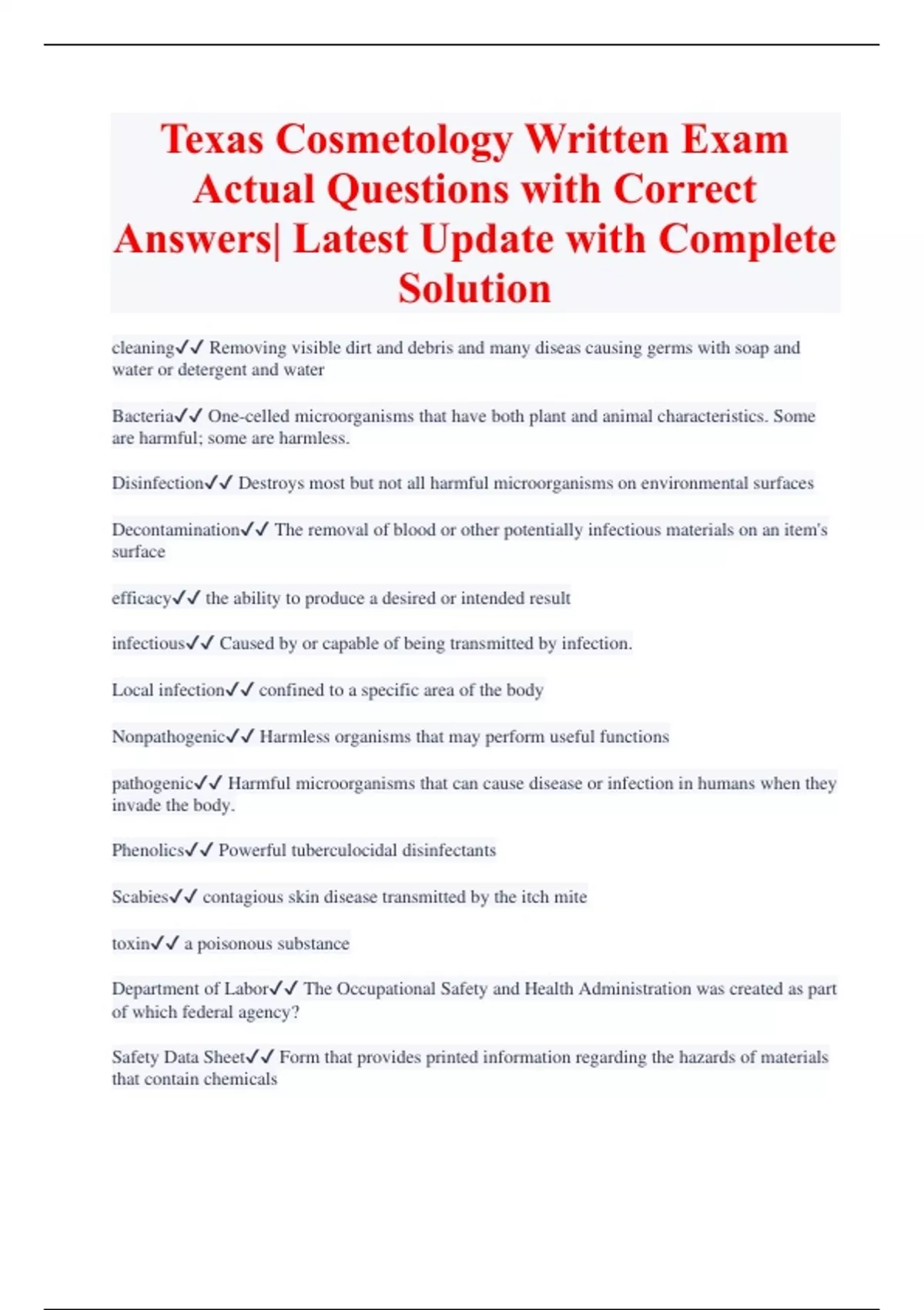 Texas Cosmetology Written Exam Actual Questions with Correct Answers| Latest Update with Complete Solution cleaning Removing visible dirt and debris and many diseas causing germs with soap and water or detergent and water Bacteria One-celled microorganisms that have both plant and animal characteristics. Some are harmful; some are harmless. Disinfection Destroys most but not all harmful microorganisms on environmental surfaces Decontamination The removal of blood or other potentially infectious materials on an item's surface efficacy the ability to produce a desired or intended result infectious Caused by or capable of being transmitted by infection. Local infection confined to a specific area of the body Nonpathogenic Harmless organisms that may perform useful functions pathogenic Harmful microorganisms that can cause disease or infection in humans when they invade the body. Phenolics Powerful tuberculocidal disinfectants Scabies contagious skin disease transmitted by the itch mite toxin a poisonous substance Department of Labor The Occupational Safety and Health Administration was created as part of which federal agency? Safety Data Sheet Form that provides printed information regarding the hazards of materials that contain chemicals