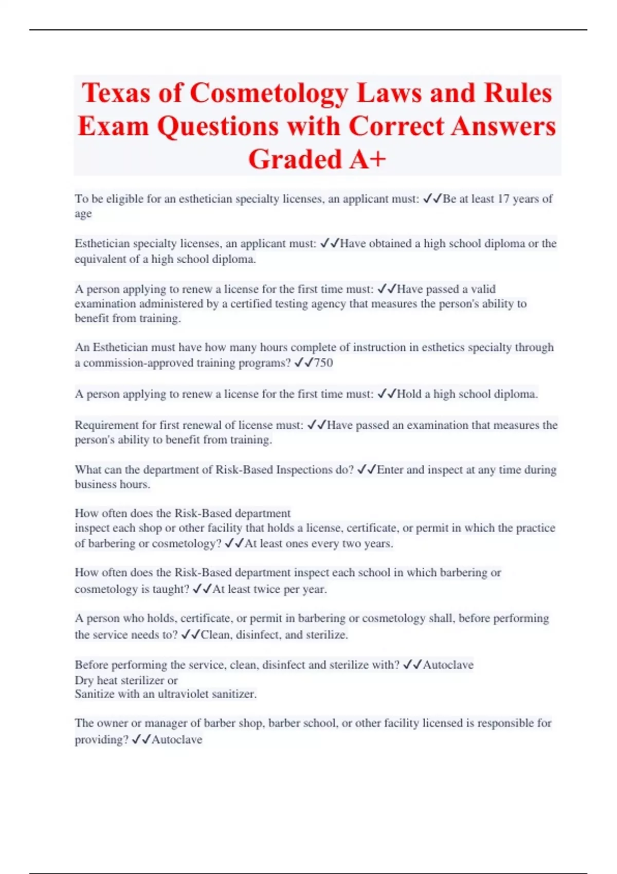Texas of Cosmetology Laws and Rules Exam Questions with Correct Answers Graded A+ To be eligible for an esthetician specialty licenses, an applicant must: Be at least 17 years of age Esthetician specialty licenses, an applicant must: Have obtained a high school diploma or the equivalent of a high school diploma. A person applying to renew a license for the first time must: Have passed a valid examination administered by a certified testing agency that measures the person's ability to benefit from training. An Esthetician must have how many hours complete of instruction in esthetics specialty through a commission-approved training programs? 750 A person applying to renew a license for the first time must: Hold a high school diploma. Requirement for first renewal of license must: Have passed an examination that measures the person's ability to benefit from training. What can the department of Risk-Based Inspections do? Enter and inspect at any time during business hours. How often does the Risk-Based department inspect each shop or other facility that holds a license, certificate, or permit in which the practice of barbering or cosmetology? At least ones every two years. How often does the Risk-Based department inspect each school in which barbering or cosmetology is taught? At least twice per year.