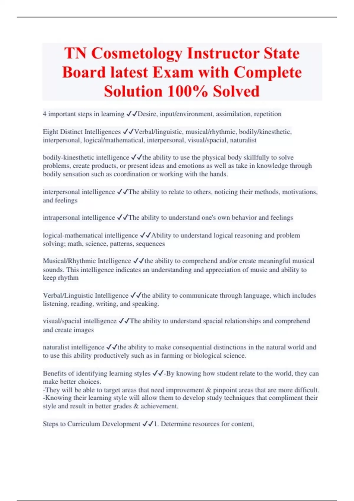 TN Cosmetology Instructor State Board latest Exam with Complete Solution 100% Solved 4 important steps in learning Desire, input/environment, assimilation, repetition Eight Distinct Intelligences Verbal/linguistic, musical/rhythmic, bodily/kinesthetic, interpersonal, logical/mathematical, interpersonal, visual/spacial, naturalist bodily-kinesthetic intelligence the ability to use the physical body skillfully to solve problems, create products, or present ideas and emotions as well as take in knowledge through bodily sensation such as coordination or working with the hands. interpersonal intelligence The ability to relate to others, noticing their methods, motivations, and feelings intrapersonal intelligence The ability to understand one's own behavior and feelings logical-mathematical intelligence Ability to understand logical reasoning and problem solving; math, science, patterns, sequences Musical/Rhythmic Intelligence the ability to comprehend and/or create meaningful musical sounds. This intelligence indicates an understanding and appreciation of music and ability to keep rhythm Verbal/Linguistic Intelligence the ability to communicate through language, which includes listening, reading, writing, and speaking. visual/spacial intelligence The ability to understand spacial relationships and comprehend and create images