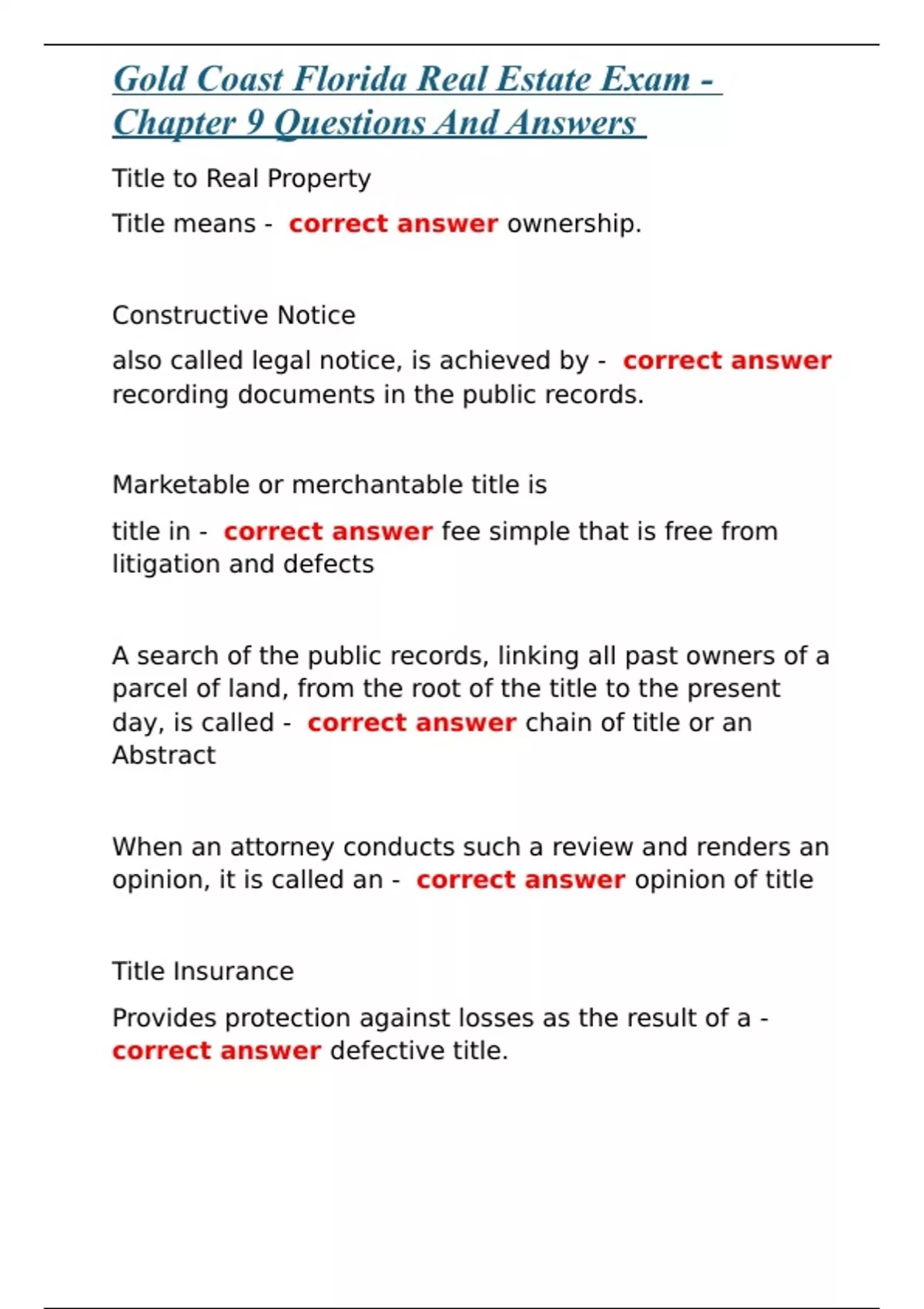 Gold Coast Florida Real Estate Exam - Chapter 9 Questions And Answers