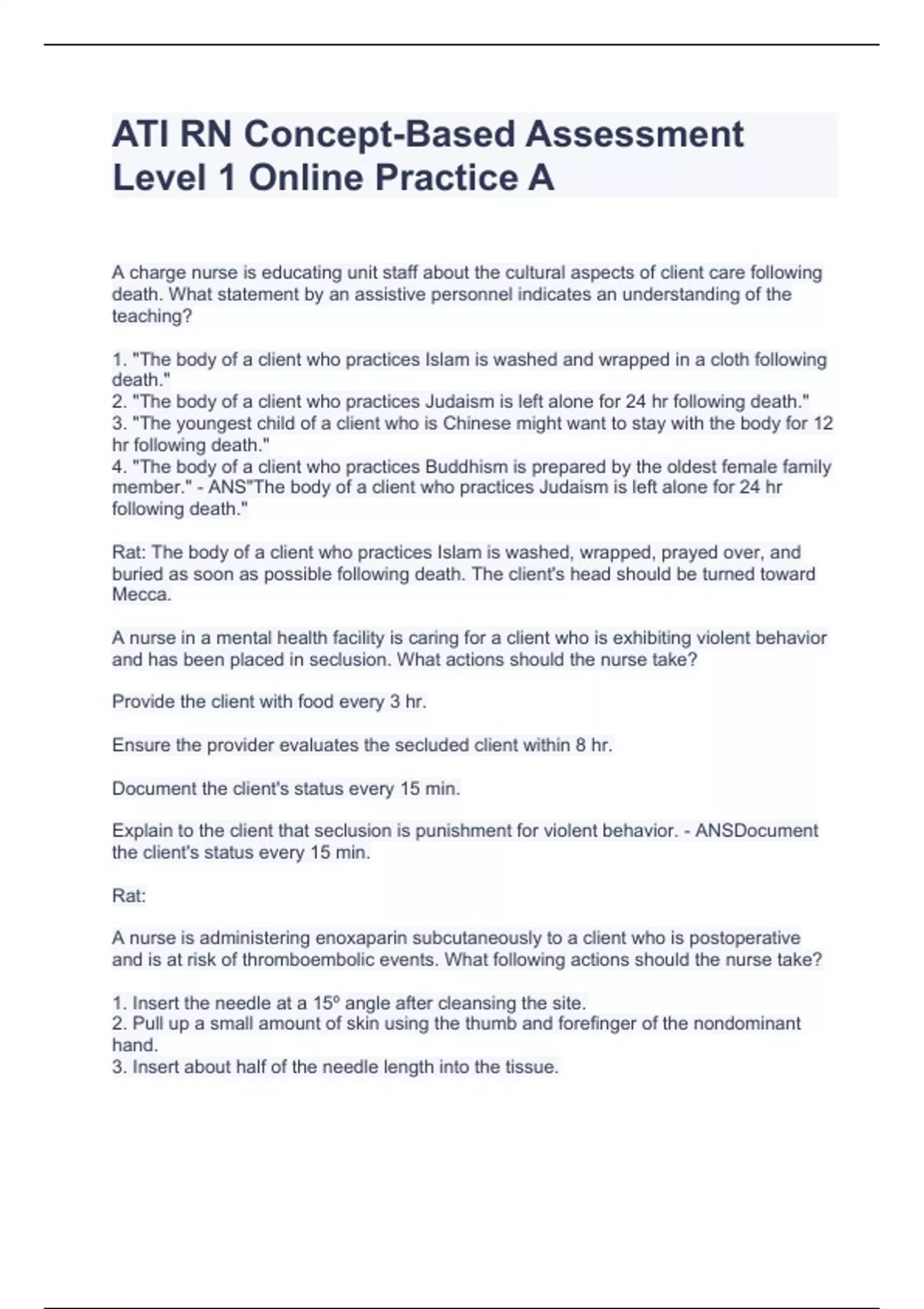ATI RN Concept BASED ASSESSMENT LEVEL 1 ONLINE PRACTICE A.