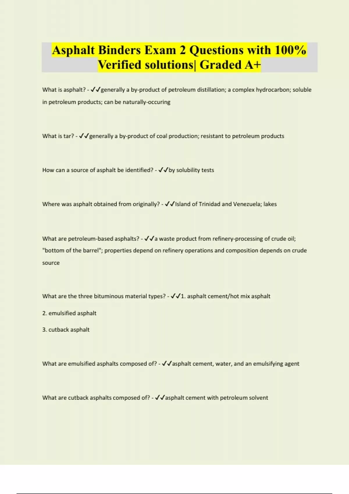 Asphalt Binders Exam 2 Questions with 100% Verified solutions| Graded A+