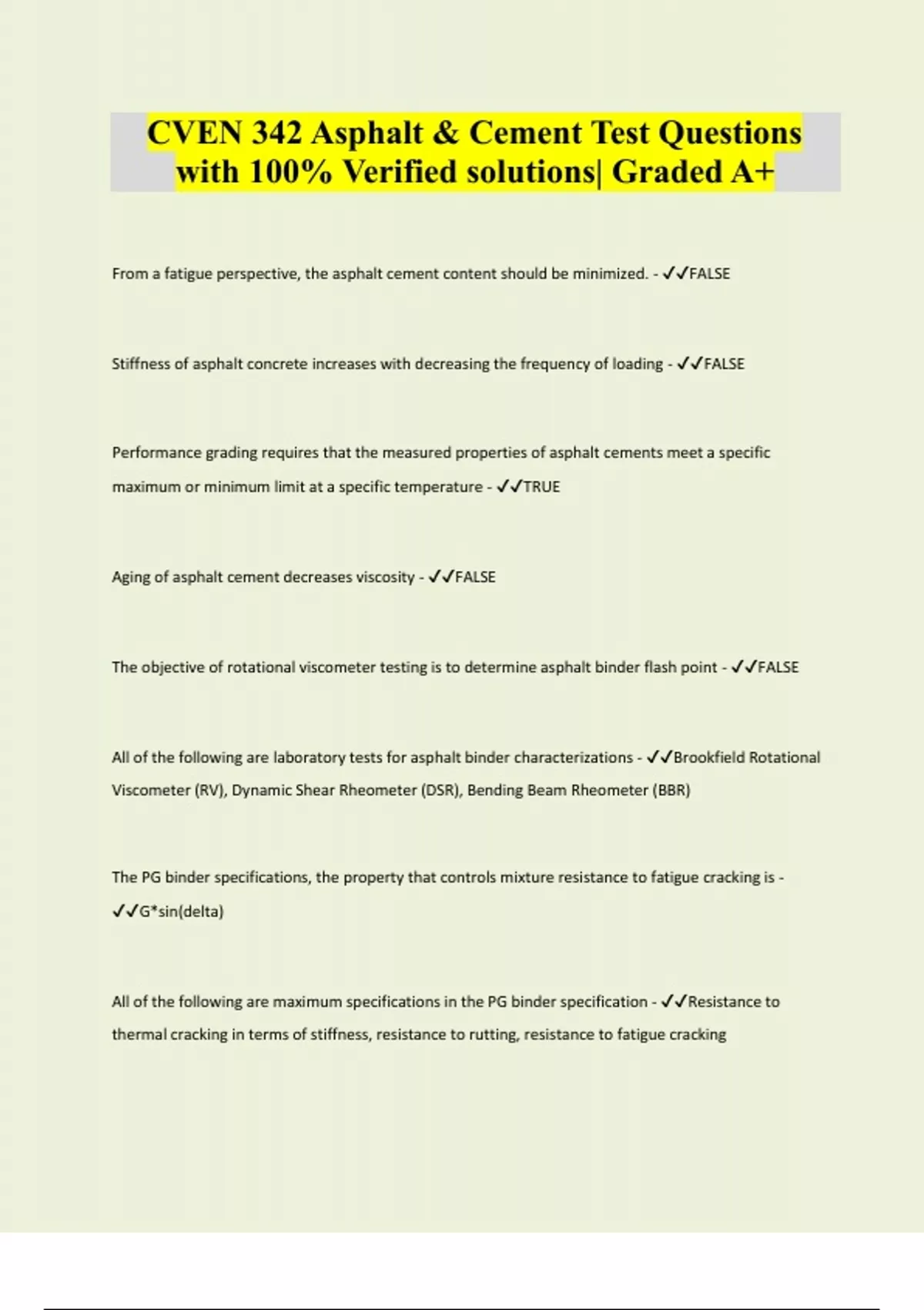 CVEN 342 Asphalt & Cement Test Questions with 100% Verified solutions| Graded A+
