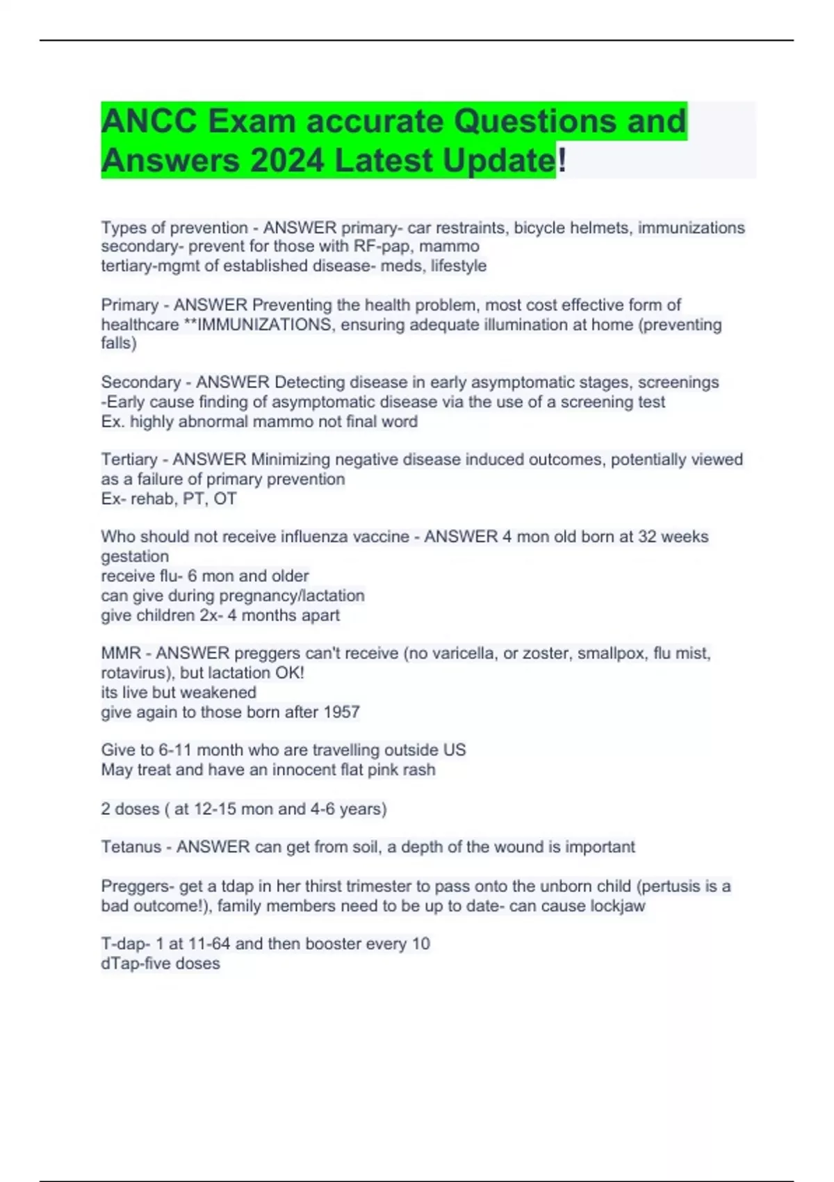 ANCC Exam accurate Questions and ATypes of prevention - ANSWER primary- car restraints, bicycle helmets, immunizations secondary- prevent for those with RF-pap, mammo tertiary-mgmt of established disease- meds, lifestyle Primary - ANSWER Preventing the health problem, most cost effective form of healthcare **IMMUNIZATIONS, ensuring adequate illumination at home (preventing falls) Secondary - ANSWER Detecting disease in early asymptomatic stages, screenings -Early cause finding of asymptomatic disease via the use of a screening test Ex. highly abnormal mammo not final word Tertiary - ANSWER Minimizing negative disease induced outcomes, potentially viewed as a failure of primary prevention Ex- rehab, PT, OT Who should not receive influenza vaccine - ANSWER 4 mon old born at 32 weeks gestation receive flu- 6 mon and older can give during pregnancy/lactation give children 2x- 4 months apart MMR - ANSWER preggers can't receive (no varicella, or zoster, smallpox, flu mist, rotavirus), but lactation OK! its live but weakened give again to those born after 1957 Give to 6-11 month who are travelling outside US May treat and have an innocent flat pink rash 2 doses ( at 12-15 mon and 4-6 years) Tetanus - ANSWER can get from soil, a depth of the wound is important Preggers- get a tdap in her thirst trimester to pass onto the unborn child (pertusis is a bad outcome!), family members need to be up to date- can cause lockjaw T-dap- 1 at 11-64 and then booster every 10 dTap-five doses Pertussis- uncontrollable cough, vomitting, fatigue, dx: nasopharyngeal culture and PCR testing tx: Azithromycin No pap smear - ANSWER prior to 21 or in elderly Benadryl - ANSWER older, cross BBB, can cause sedation, urinary retention (bad for BPH) herpes zoster - ANSWER stronger chickenpox vaccine-zoster vaccine post-herpetic neuralgia- persists after 1 month Herpes keratitis is damage to the corneal epithelium caused by the herpes virus, commonly shingles. The patient usually has acute onset of eye pain, photophobia, and blurred vision in the affected eye. primary open angle glaucoma - ANSWER peripheral vision loss, elevated intraocular pressure, deep-cupping of optic disc, tx with beta-adrenergic antag (Timolol), alpha agonists, prostaglandin analogues Glaucoma screening test- Tonometry Normative aging - ANSWER Need for increased illumination Macular degeneration - ANSWER central vision loss, common cause of new onset blindness in elderly More females Screening tests- Amsler grid test Meniere's disease (idio) vs. Meniere's syndrome (secondary) - ANSWER dizziness, tinnitius, nystagmus, vertigo RF: ototoxic drugs, tx: benzos for rest and corticosteroids for anti-inflam oral cancer - ANSWER ulcerated lesion with indurated margins, most common SCC, RF: HPV 16, screening at dental visits beta lacatams with allergic reactions - ANSWER penecillins, cephalosporins, carbapenems rashes with Epstein Barr Otitis externa - ANSWER Caused by fungus- Candidia or Aspergillus/P. aeruginosa hallmark is pain on palpating tragus Tx--> fluoroquinolone AOM - ANSWER S.penumoniae (gram pos)-40-50%, tx with amox/cephalo, macrolides, resistance protein binding sites H.influenza (gram neg)- can produce beta-lactamase M.catarrhalis (gram neg)- also produces beta-lactamase, can get better without antibiotic Need abnormal ear drum (bulging TM) + pain (otalgia)/rubbing/tugging ear tx- Acetaminophen and otic drops help with ST Watchful waiting- 6 months or older, with non-severe illness, unilateral, fever <102.2, otalgia <48 <6 months-begin antibiotic!! if allergy-Cefdinir], RF: pacifier use for 10 months, feedings in the supine, smoke exposure, day care, <2- 10 days 2-6 yrs- 7 days >6 yrs- 5 days 1st line- Amox 90 BID, Amox clav BID With PCN allergy- **Cefdinir (Cephlosporins) Group A strep (GABHS) - ANSWER Streptococcus pyogenes, risk for rheumatic fever and Glomerulo., peritonsillar abscess, tx- amox then try macrolide if doesnt't improve GOLD STANDARD IS THROAT CULTURE indoor allergen - ANSWER dust mites (perennial), pets, cockroaches, mold spores Acute Bacterial rhinosinusitis - ANSWER S.penumoniae**, RF-viral infection, allergies, tobacco use, 1st line is Augmentin, penicillin allergy-Cefdinir 2nd line- if not better...Clindamycin and Cefixime Mono - ANSWER 30-50 days ago was infected before sxs, give prednisone not amox (rash), at least 50% present with spleen enlargement, wait 1 month to go back to sports Anterior and posterior cervical lymph Pharyngitis with exudate right and left upper quadrant abdominal tendernes He nswers 2024 Latest Update!