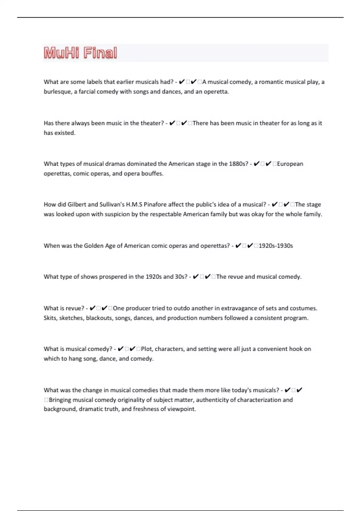 What are some labels that earlier musicals had? - ️️A musical comedy, a romantic musical play, a burlesque, a farcial comedy with songs and dances, and an operetta. Has there always been music in the theater? - ️️There has been music in theater for as long as it has existed. What types of musical dramas dominated the American stage in the 1880s? - ️️European operettas, comic operas, and opera bouffes. How did Gilbert and Sullivan's H.M.S Pinafore affect the public's idea of a musical? - ️️The stage was looked upon with suspicion by the respectable American family but was okay for the whole family. When was the Golden Age of American comic operas and operettas? - ️️1920s-1930s What type of shows prospered in the 1920s and 30s? - ️️The revue and musical comedy. What is revue? - ️️One producer tried to outdo another in extravagance of sets and costumes. Skits, sketches, blackouts, songs, dances, and production numbers followed a consistent program. What is musical comedy? - ️️Plot, characters, and setting were all just a convenient hook on which to hang song, dance, and comedy. What was the change in musical comedies that made them more like today's musicals? - ️️Bringing musical comedy originality of subject matter, authenticity of characterization and background, dramatic truth, and freshness of viewpoint.